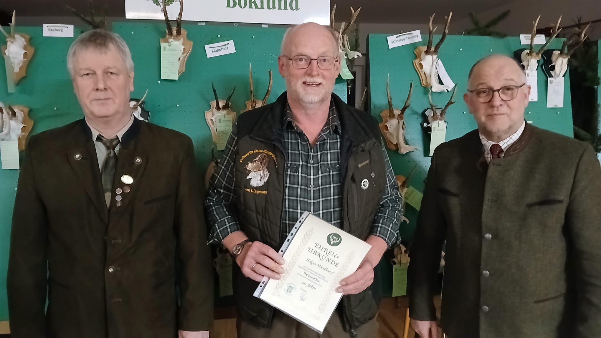 Seit 40 Jahren ist Holger Mordhorst aktiver Jäger, also Mitglied im Landesjagdverband und damit auch im für Stolk zuständigen Hegering 3b. Als dieser am 9. April im Gasthof „Zum goldenen Stern“ seine Jahresversammlung abhielt, wurde Holger Mordhorst deshalb vom Vorsitzenden der Kreisjägerschaft Schleswig, Dr. Heinz Rohling (Foto re.), mit Urkunde und Ehrennadel ausgezeichnet. Danach gratulierte ihm Hegeringleiter Bernd Gorr aus Hollmühle (li.).