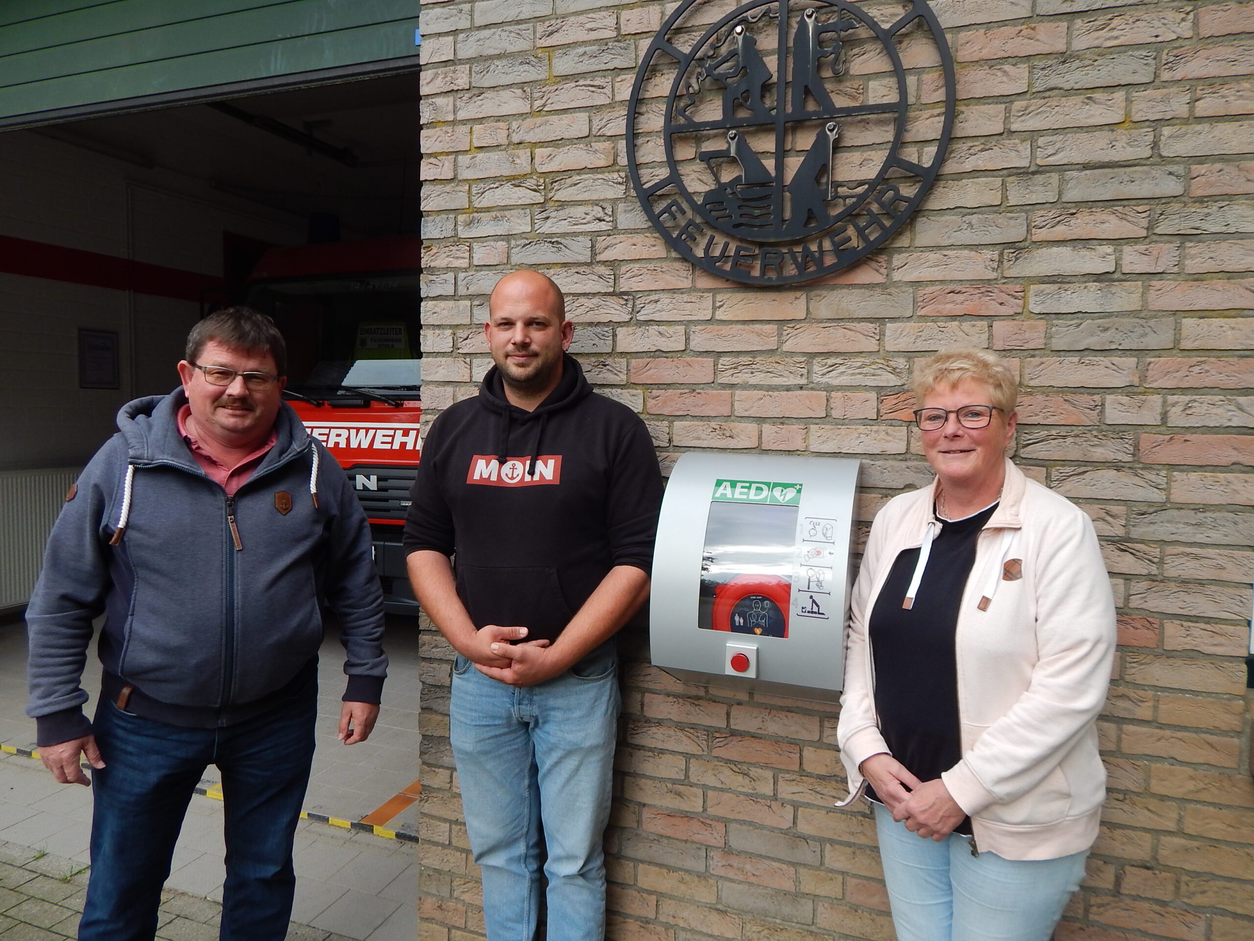 Gemeindewehrführer Alexander Hansen (Mitte) präsentiert Bürgermeister Kai Börensen und der DRK-Vorsitzenden Heike Mordhorst einen Defibrillator, der ab sofort am Feuerwehrgerätehaus bei Herzstillstand für jedermann verfügbar ist. Wenn über den Notfall Informierte ihn dort holen können, ist wirksame Hilfe schneller am Einsatzort als ein Rettungswagen.