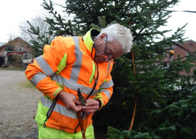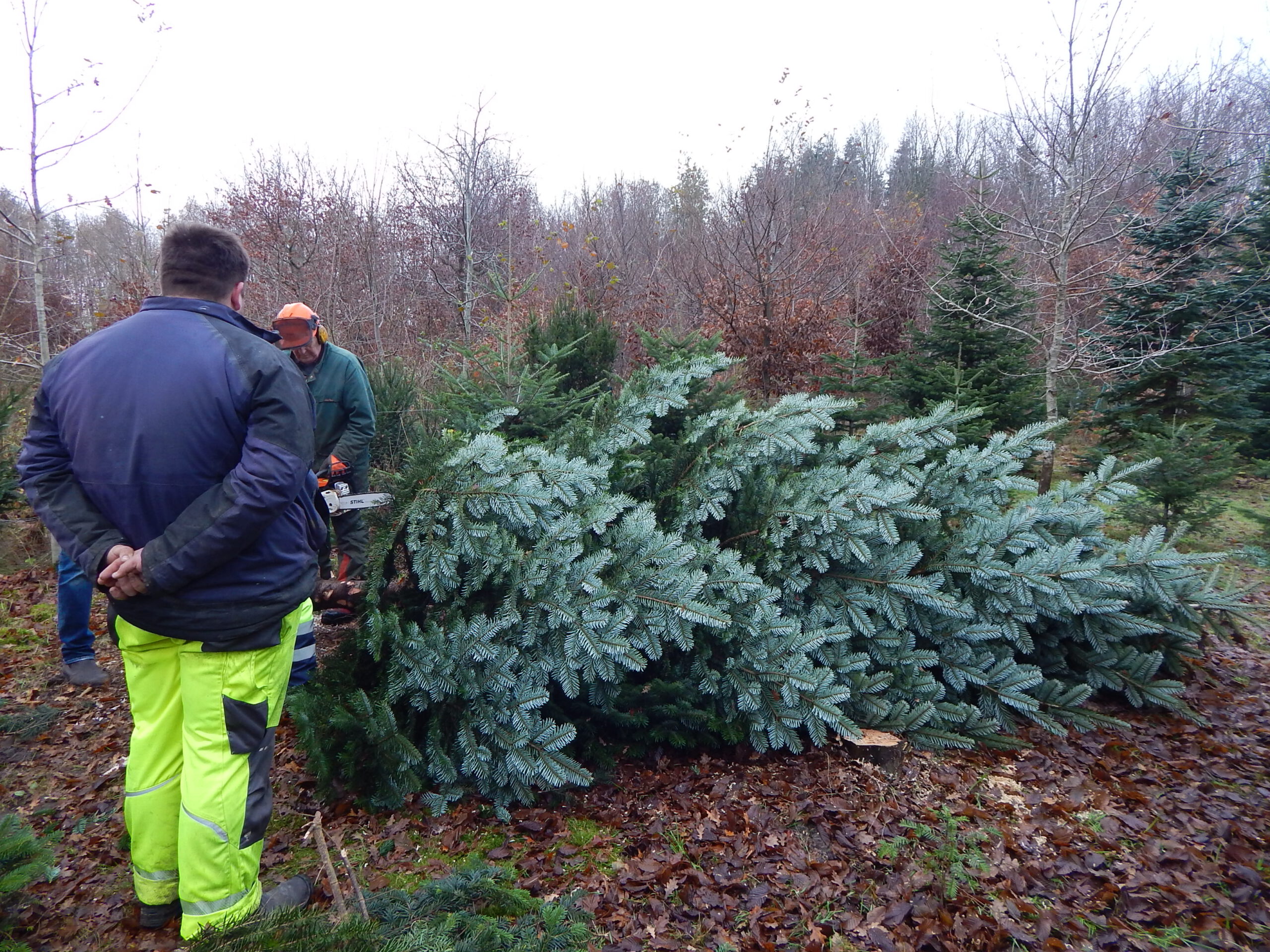 Anschließend wurde der große Baum für das Baugebiet „Scheidewiehe“ gefällt. Die Fotos enden mit der liegenden Tanne; denn beim komplizierten Abtransport des Gewichtsmonsters musste unser Fotograf mit anpacken.