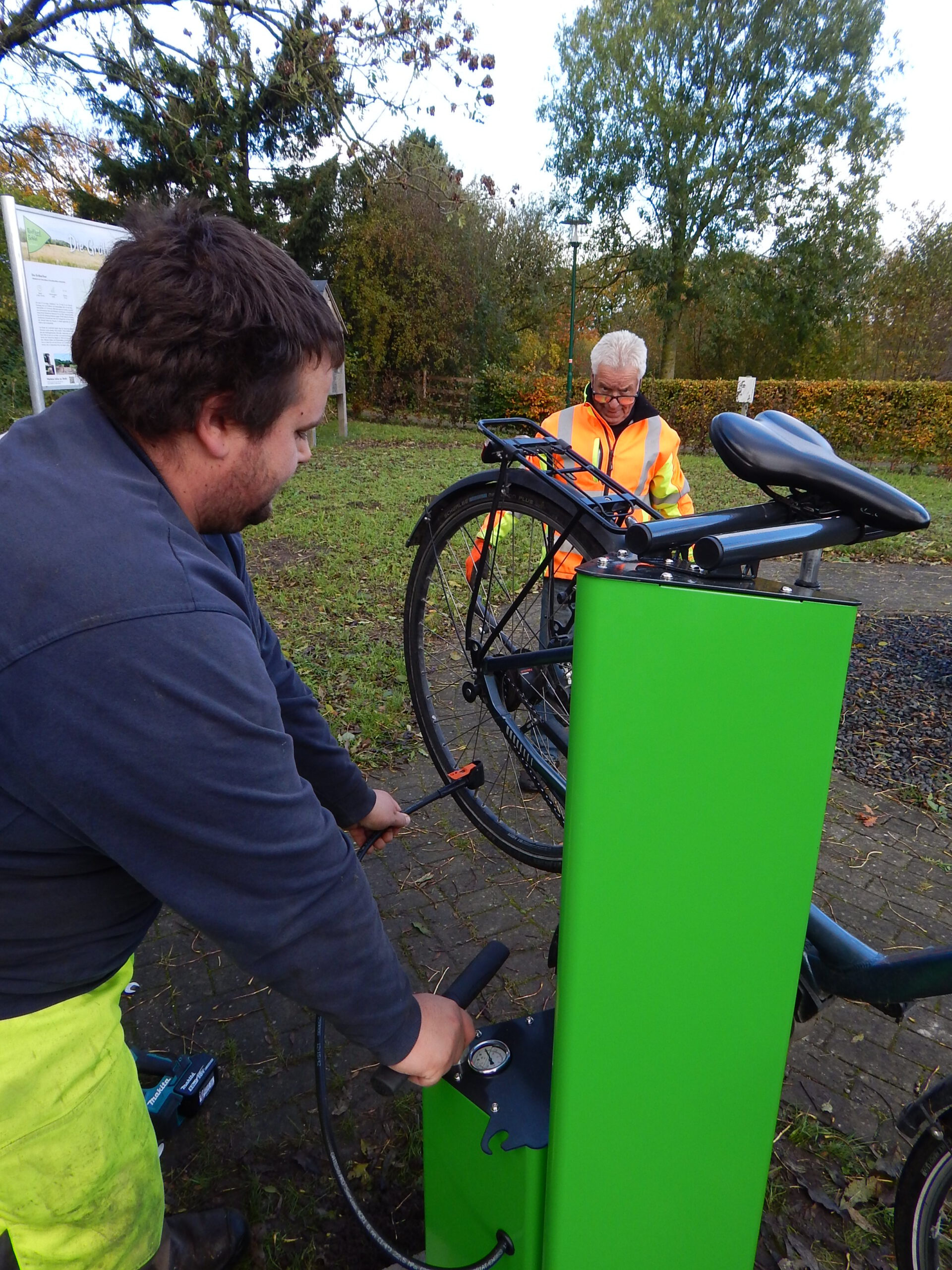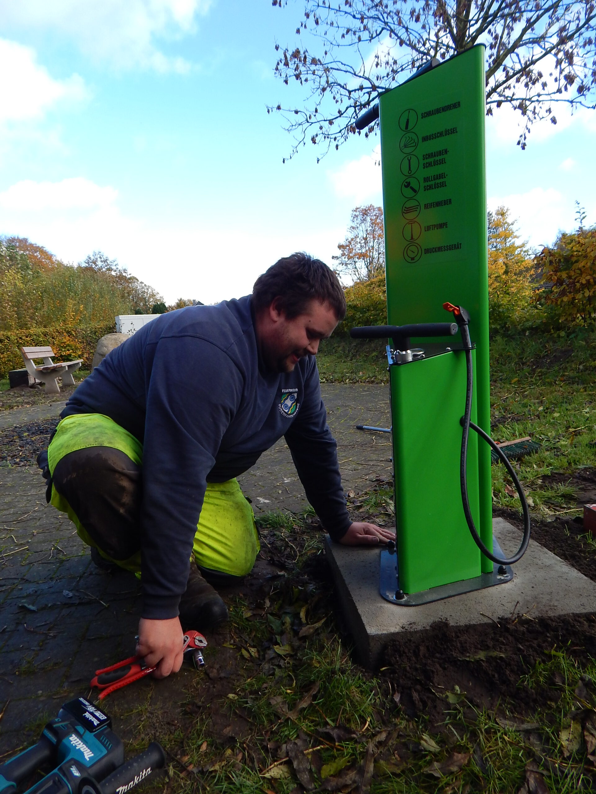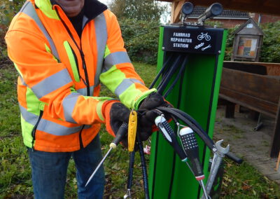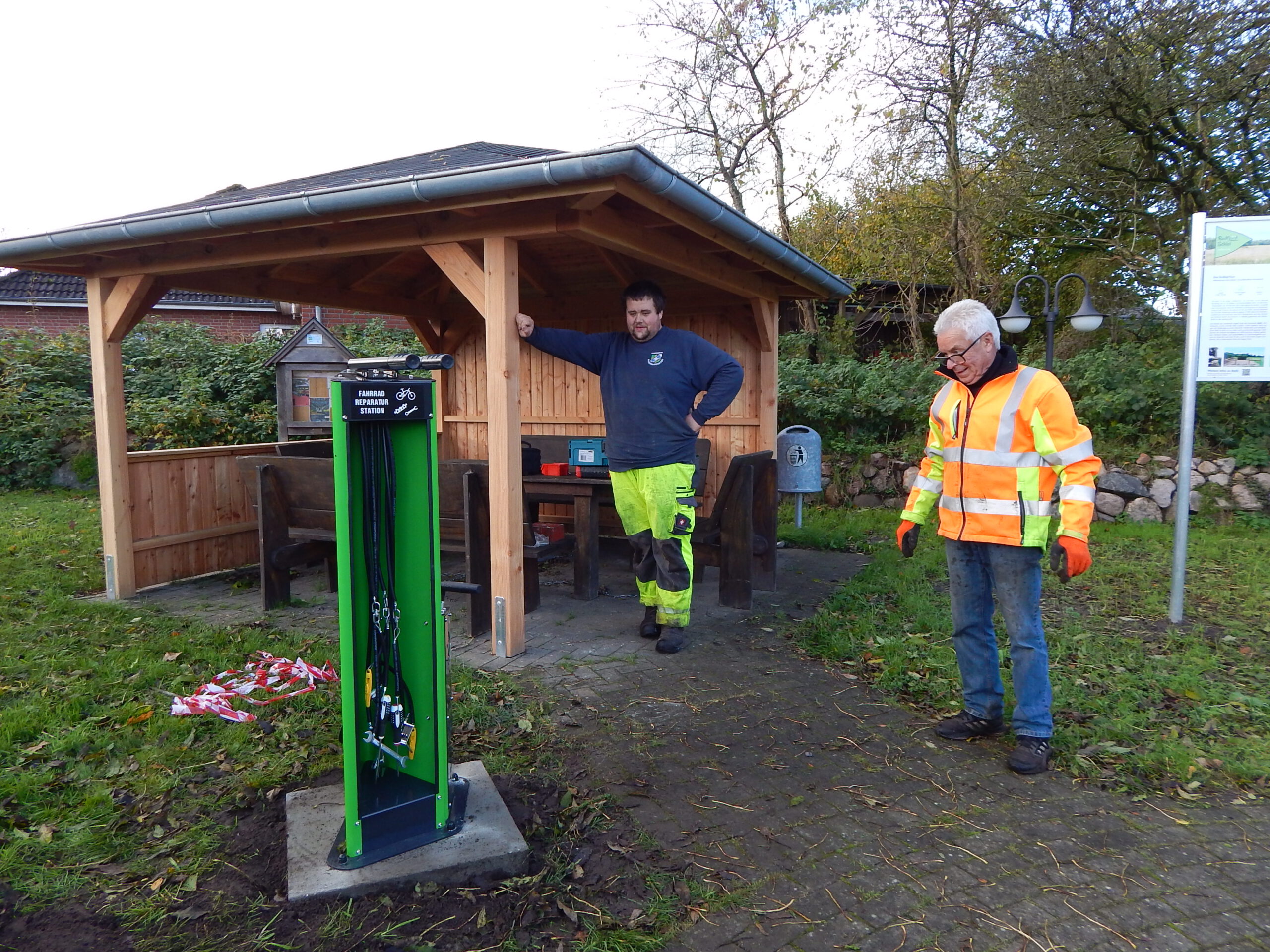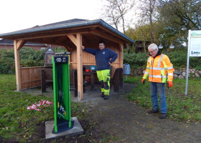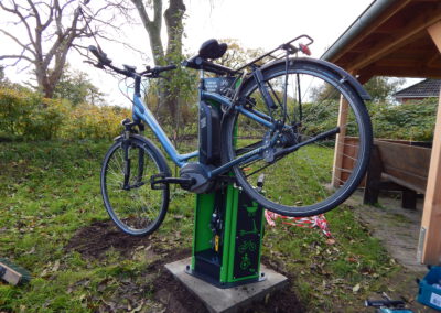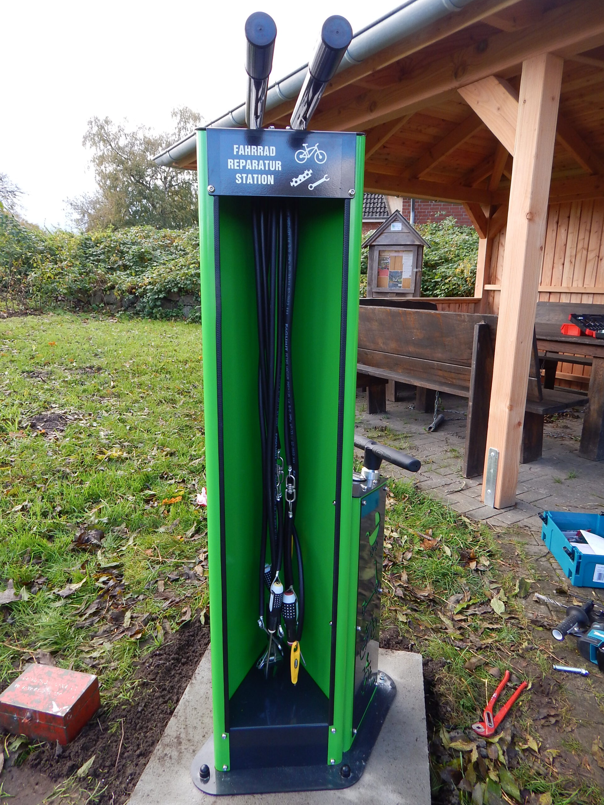 Seit vorgestern ist fertig, was auf dem „Platz am Eichenhof“ zuvor als Loch und dann als Betonfundament zu sehen war: Unsere Gemeindearbeiter Reiner Haß und Justin Paulsen haben eine Fahrrad-Reparaturstation installiert. Was damit alles möglich ist, zeigen unsere Fotos.