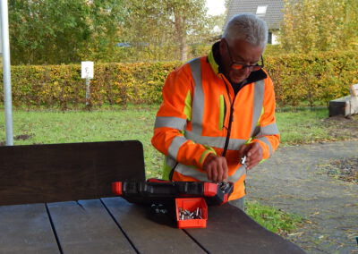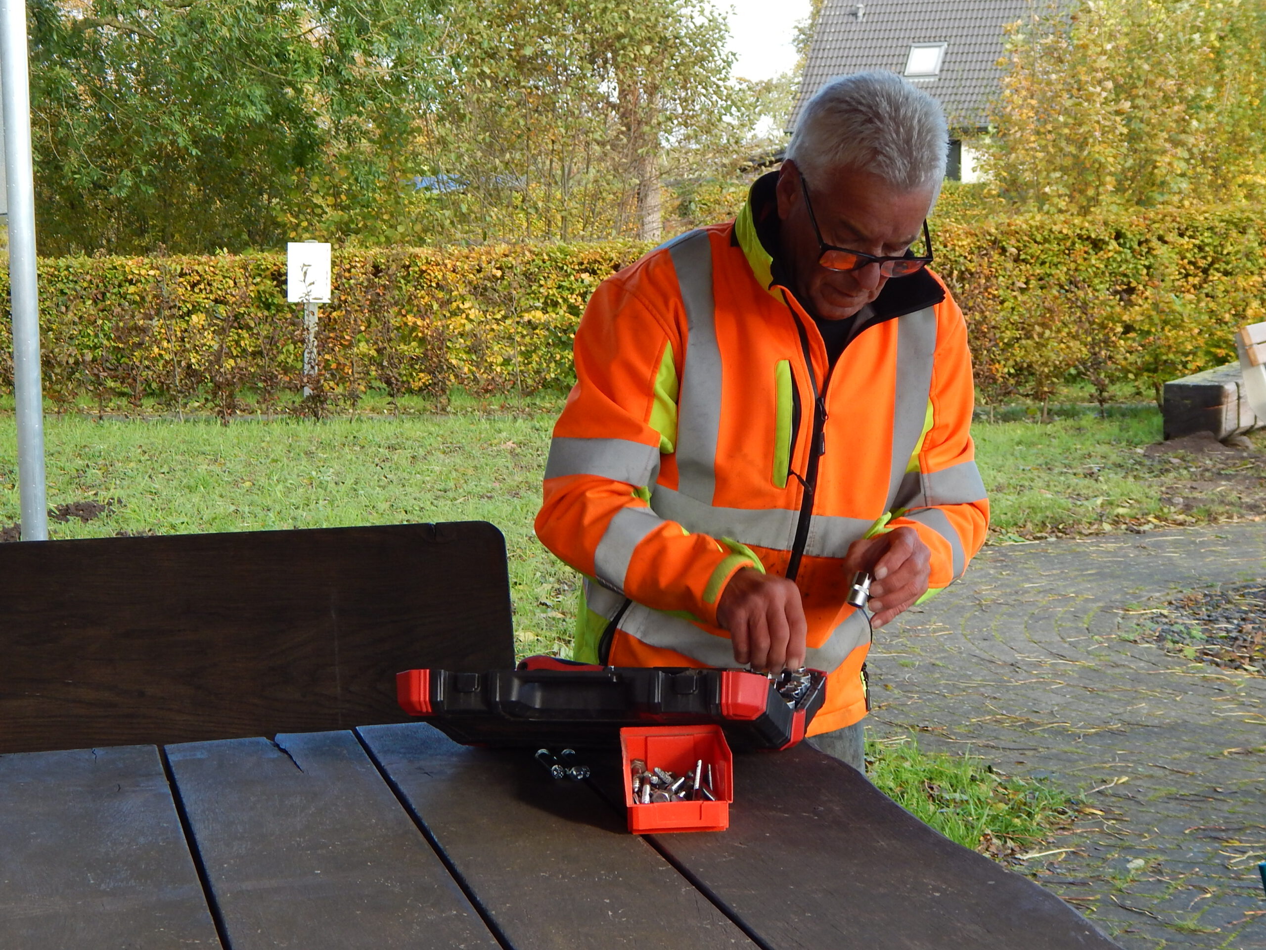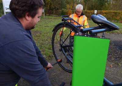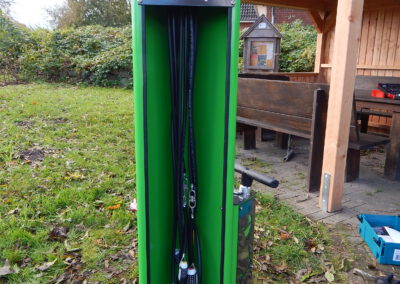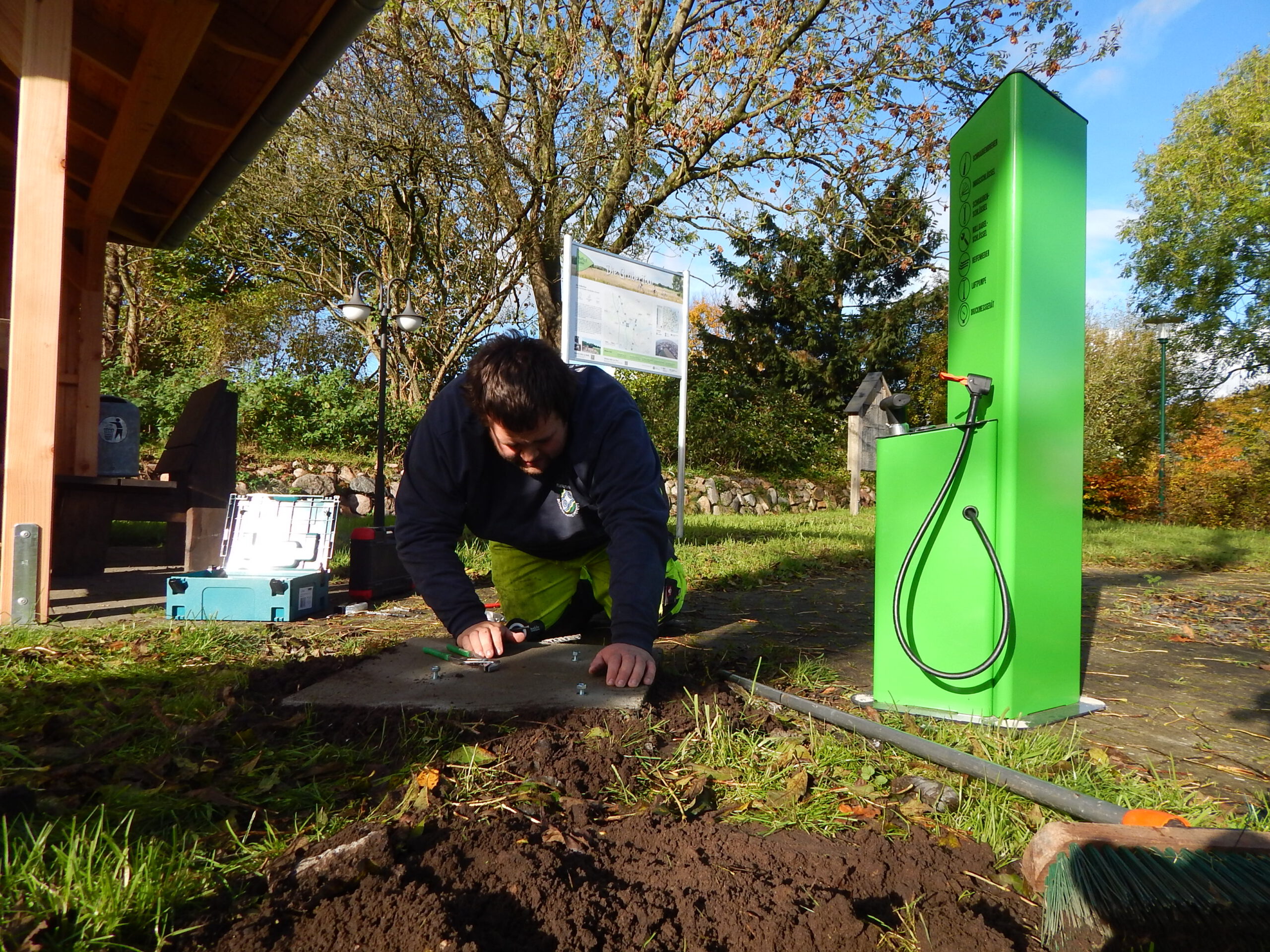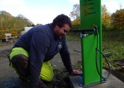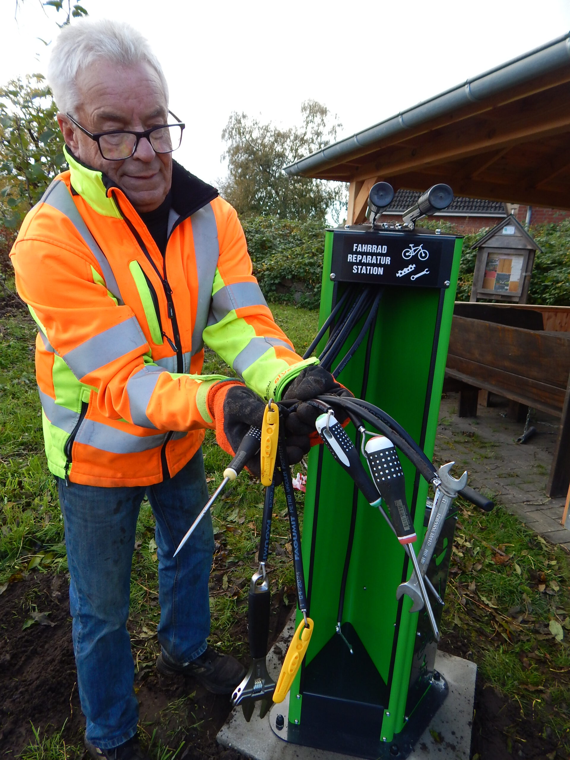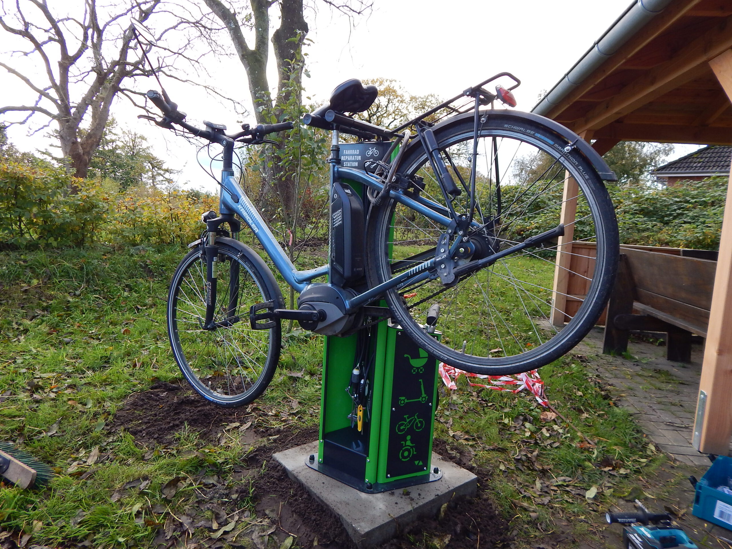 Seit vorgestern ist fertig, was auf dem „Platz am Eichenhof“ zuvor als Loch und dann als Betonfundament zu sehen war: Unsere Gemeindearbeiter Reiner Haß und Justin Paulsen haben eine Fahrrad-Reparaturstation installiert. Was damit alles möglich ist, zeigen unsere Fotos.