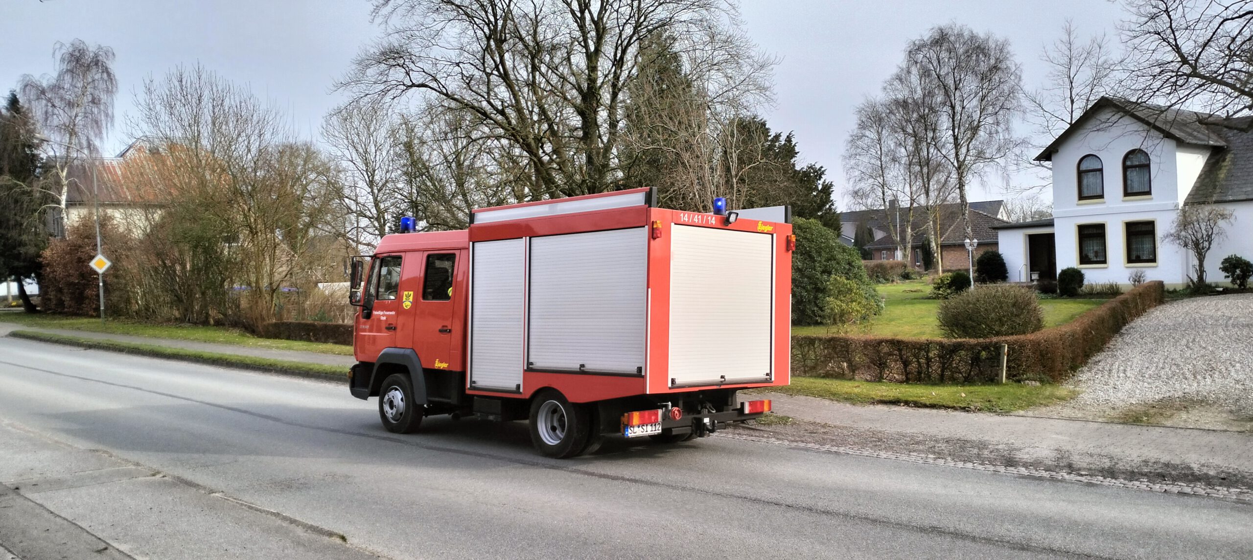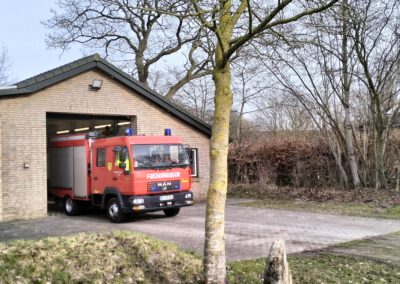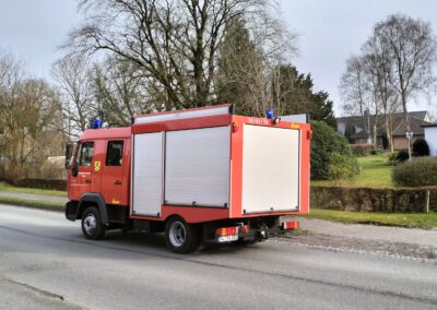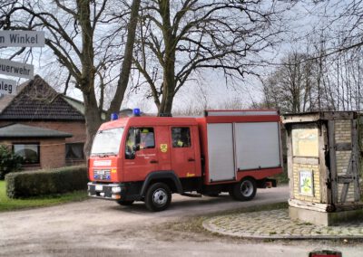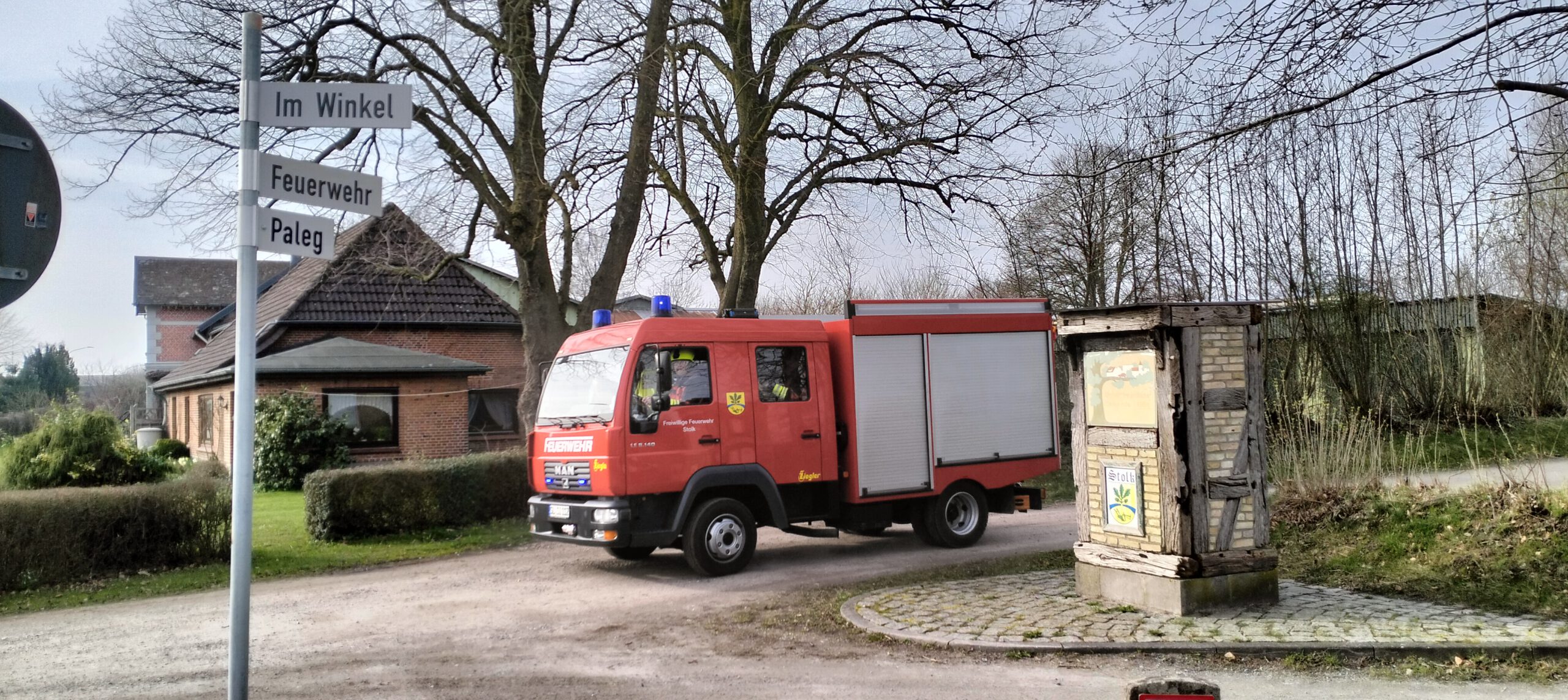 Unsere Fotos zeigen die Ansicht am Feuerwehrhaus nur vier Minuten nach den Sirenen der Umgebung (Die Oberstolker wird in den nächsten Tagen repariert): Da wird das Einsatzfahrzeug bereits mit Blaulicht herausgefahren. Die beiden letzten Bilder entstanden nur drei Minuten später: Da war der Wagen ausreichend besetzt und die Einsatzfahrt begann. Für Freiwillige, die erst von zuhaus oder sonstwo zum Gerätehaus kommen und sich dort umziehen müssen, verdient diese Schnelligkeit Respekt!