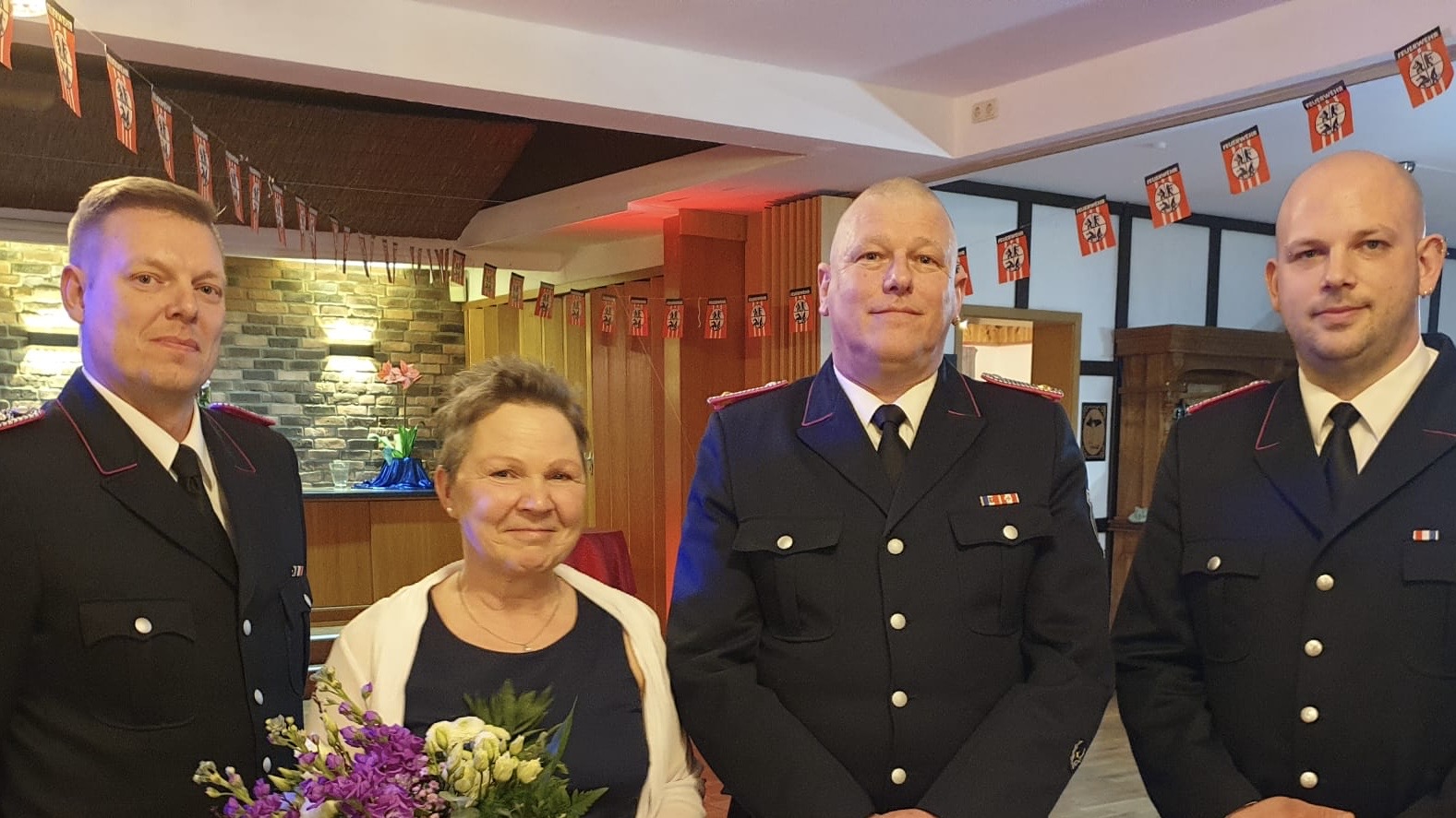 Ein besonderer Dank wurde an den ehemaligen Wehrführer Hartmut Kühl ausgesprochen. Er hat sich in seiner 10-jährigen Amtszeit als Wehrführer für die Modernisierung der Wehr eingesetzt. Ihm und seiner Frau Karin wurden ein Gutschein und ein Strauß Blumen überreicht.