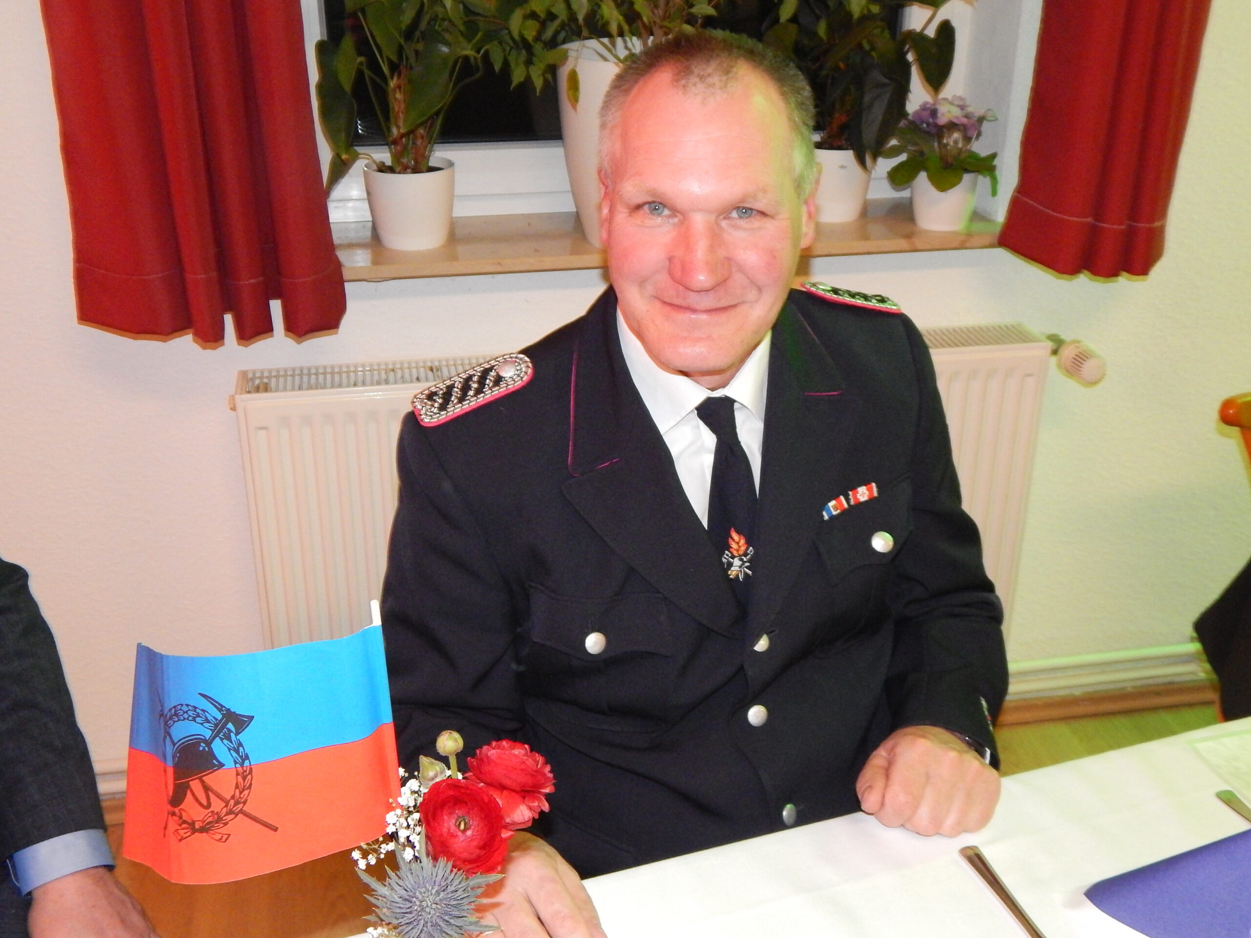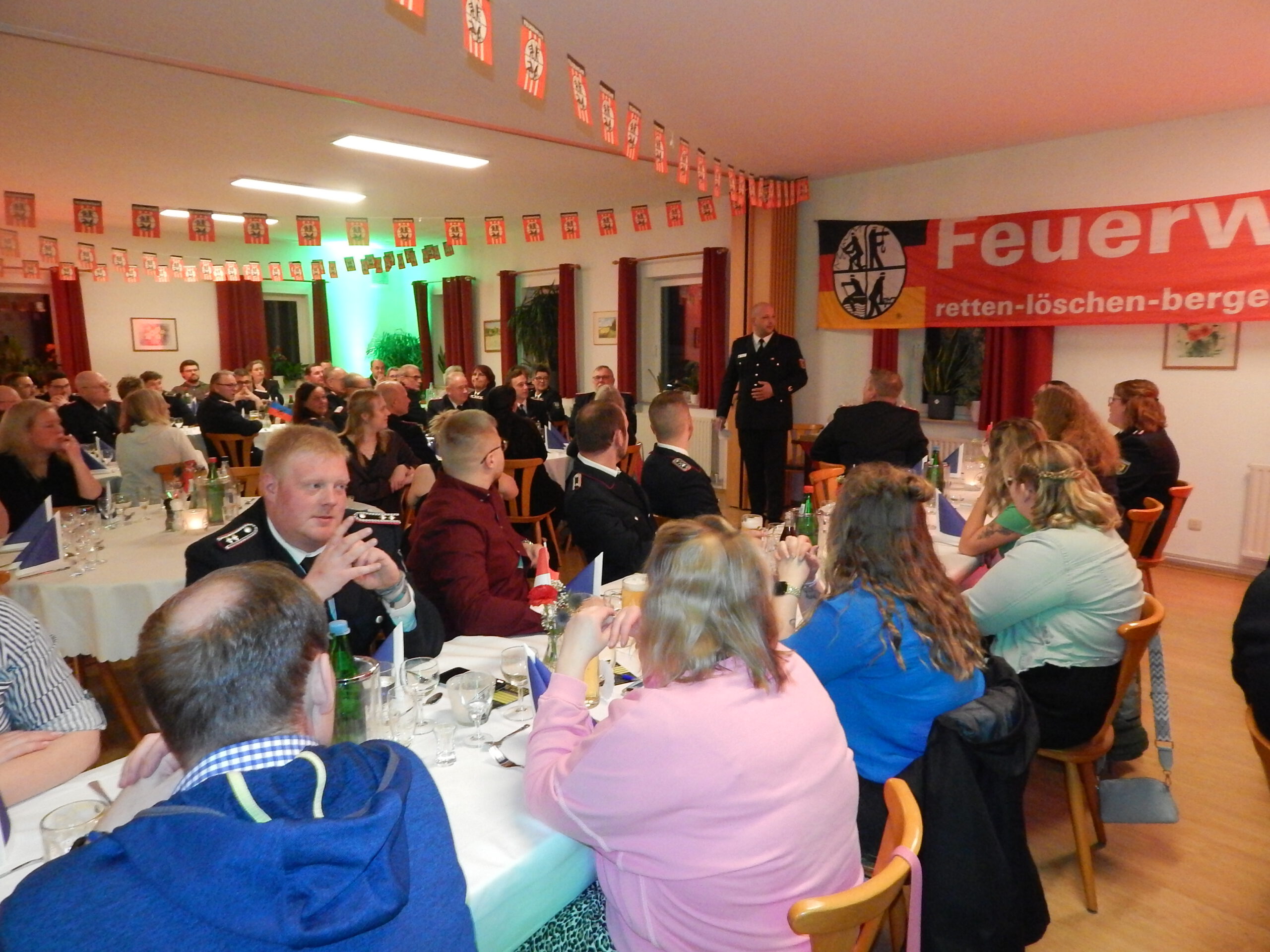 Bevor allen ein reich dimensioniertes Essen schmeckte, gab es Ehrungen und Grußworte. Zunächst betraf das die Stolker Wehrführung selbst: Sowohl Alexander Hansen als auch sein Stellvertreter Sven Boysen wurden für 20 aktive Jahre mit dem entsprechenden Dienstzeitabzeichen ausgezeichnet. Anschließend beförderten die beiden ihren Kameraden Frank Feilberg zum Löschmeister, weil er seit 26 Jahren mit regelmäßigen Kontrollen Atemschutzgeräteträger ist, seit 17 Jahren im Festausschuss, immer hilfsbereit, „und alles erledigst du akribisch und verlässlich. Wir sind stolz auf dich!“