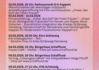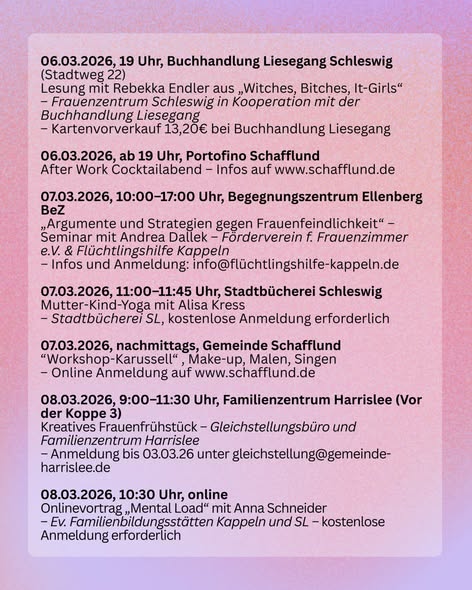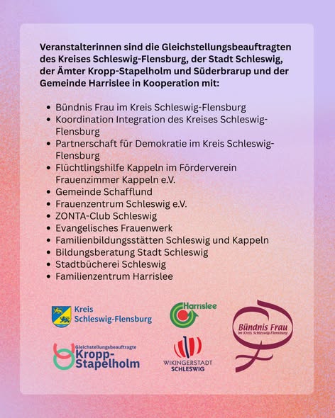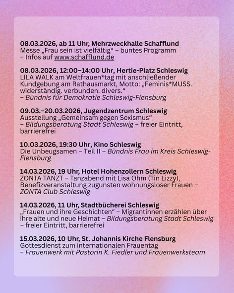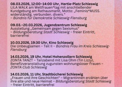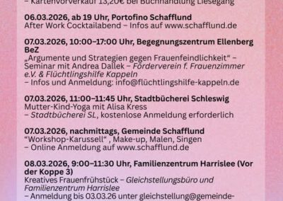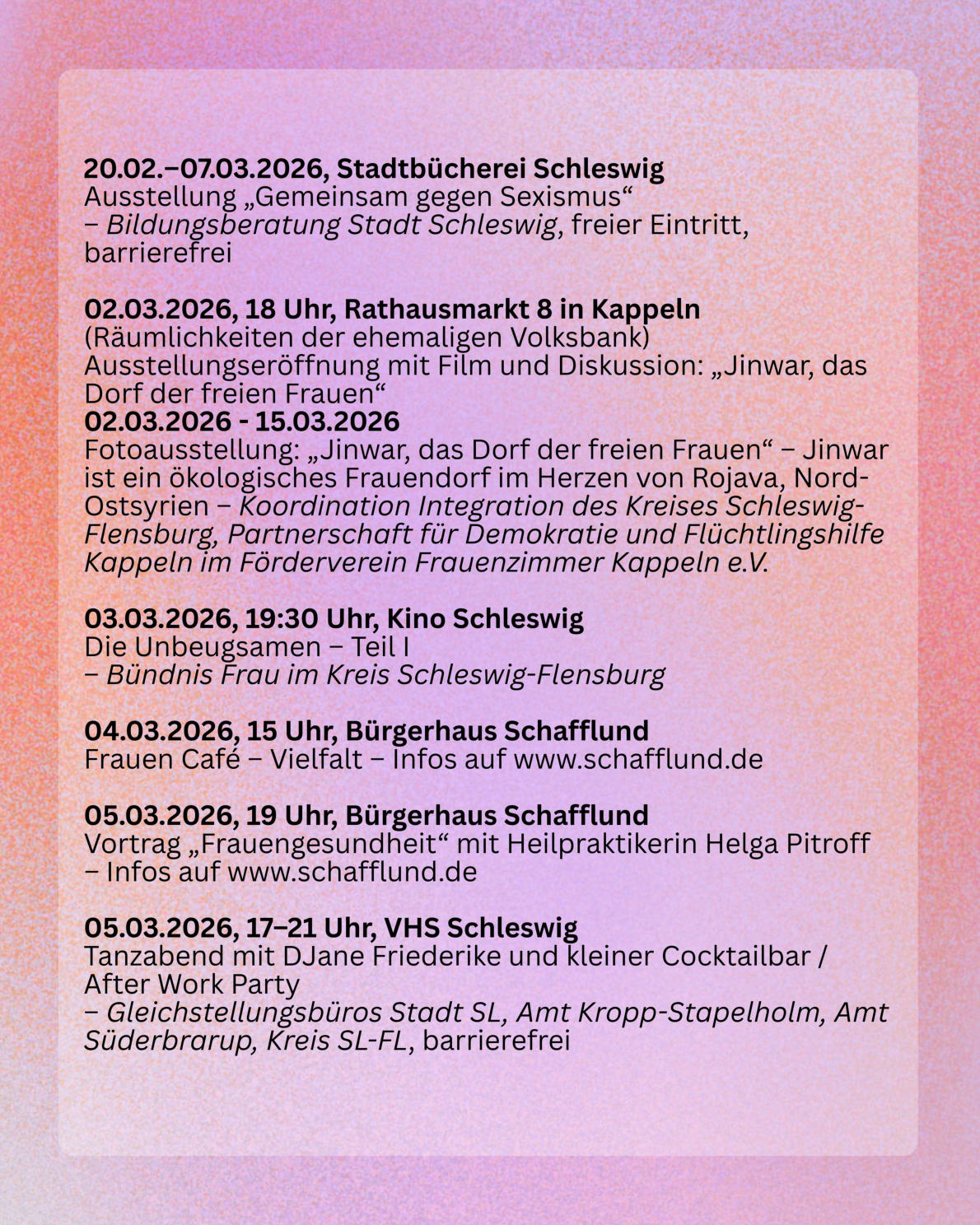 Rund um den Internationalen Frauentag am Sonntag, dem 8. März, feiert der Kreis Schleswig-Flensburg mit zahlreichen Veranstaltungen im gesamten Kreisgebiet. Gemeinsam setzen Institutionen, Bündnisse und Vereine ein starkes Zeichen für Gleichstellung, Frauenrechte, Sichtbarkeit und gesellschaftliches Engagement.