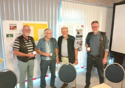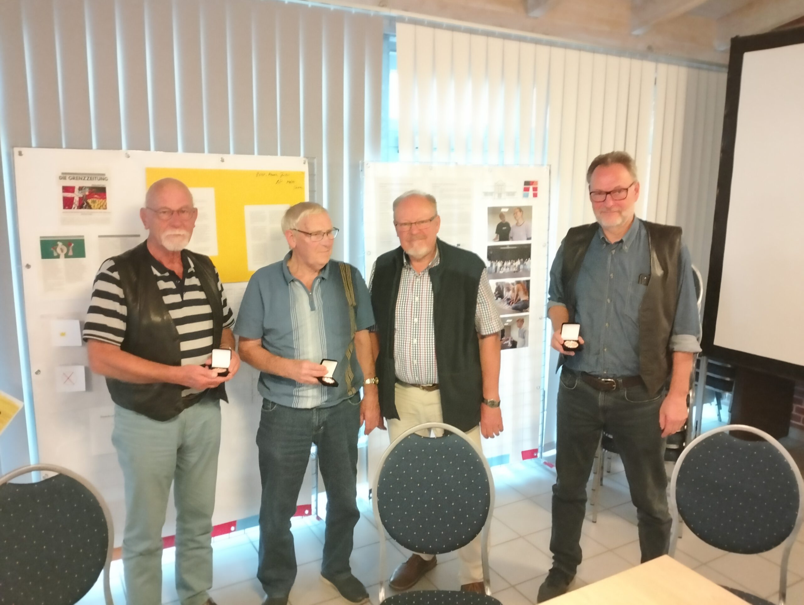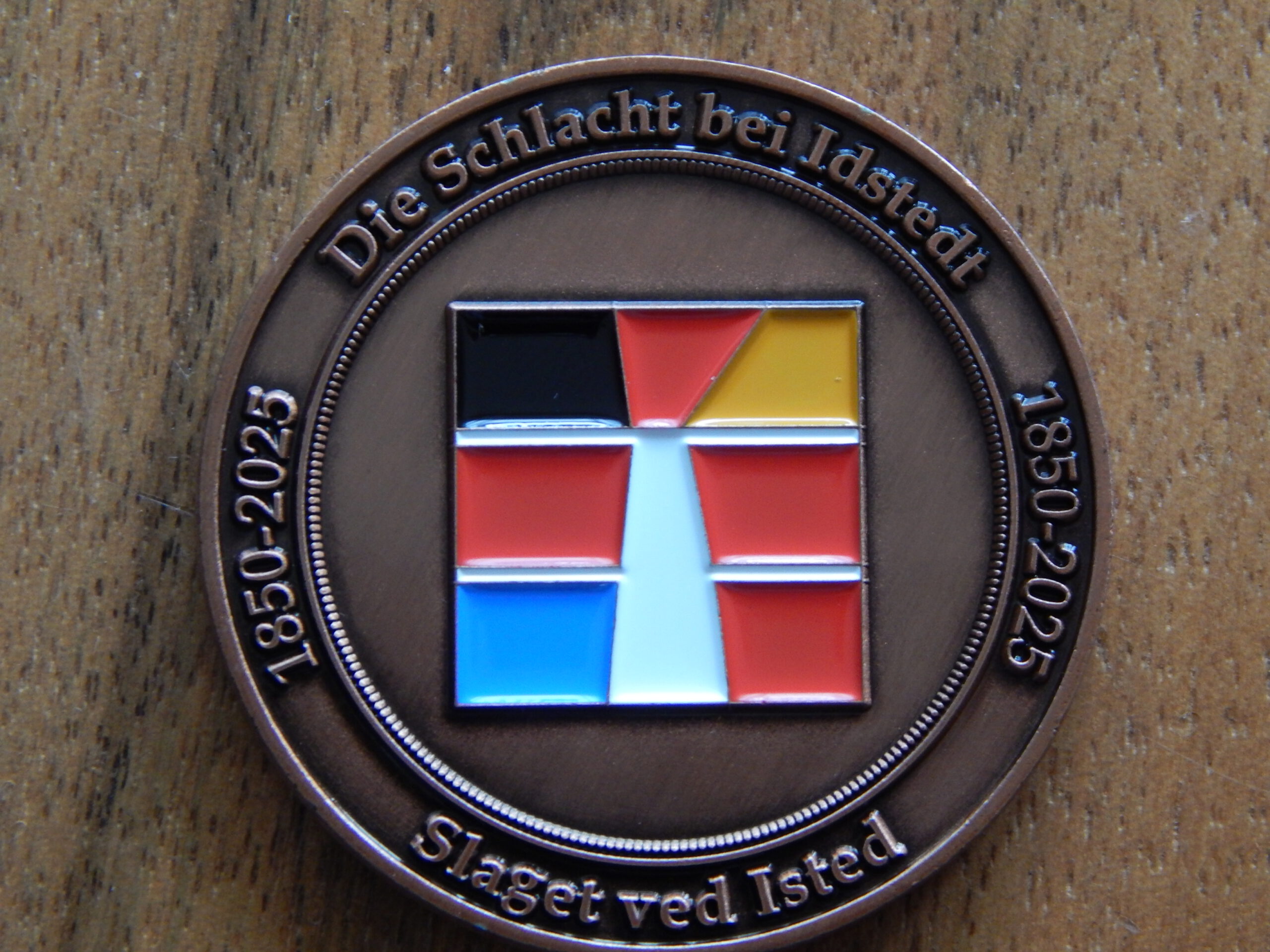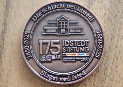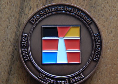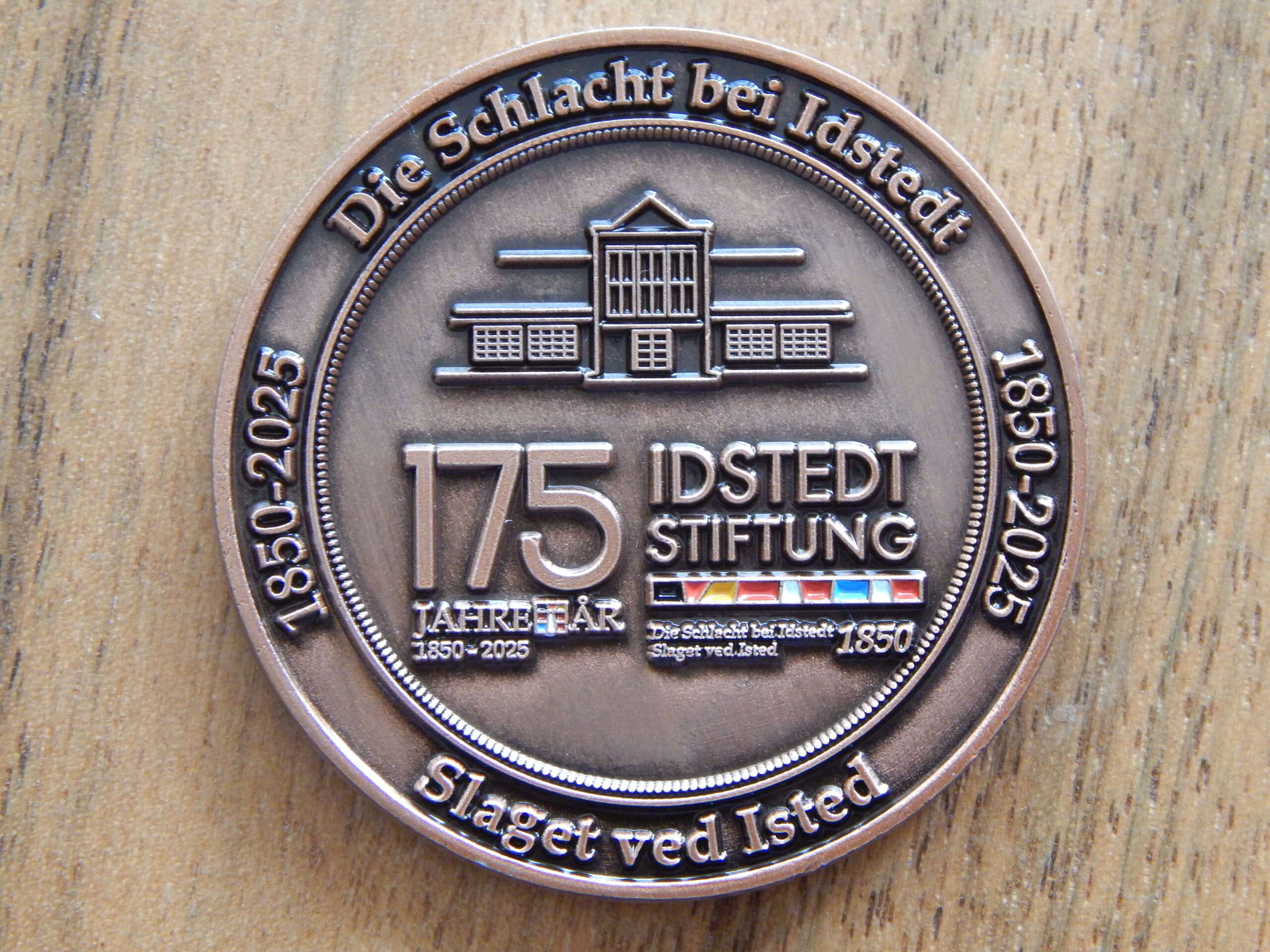 Unser Foto zeigt (v.re.) den Stolker Johannes Jessen und die beiden Idstedter Edgar Petersen und Heinz Schulze, die eine Gedenkmünze in die Kamera halten. Erhalten haben die Drei sie vom Kreispräsidenten Walter Behrens (2.v.re.) als Dank und Anerkennung für ihr Engagement in der ein Jahr vorher begonnenen Planung sowie der viertägigen Durchführung der Jubiläumsfeierlichkeiten anlässlich des 175. Jahrestages der Schlacht bei Idstedt. In zwei weiteren Fotos zeigen wir die beiden Seiten der Gedenkmünze.