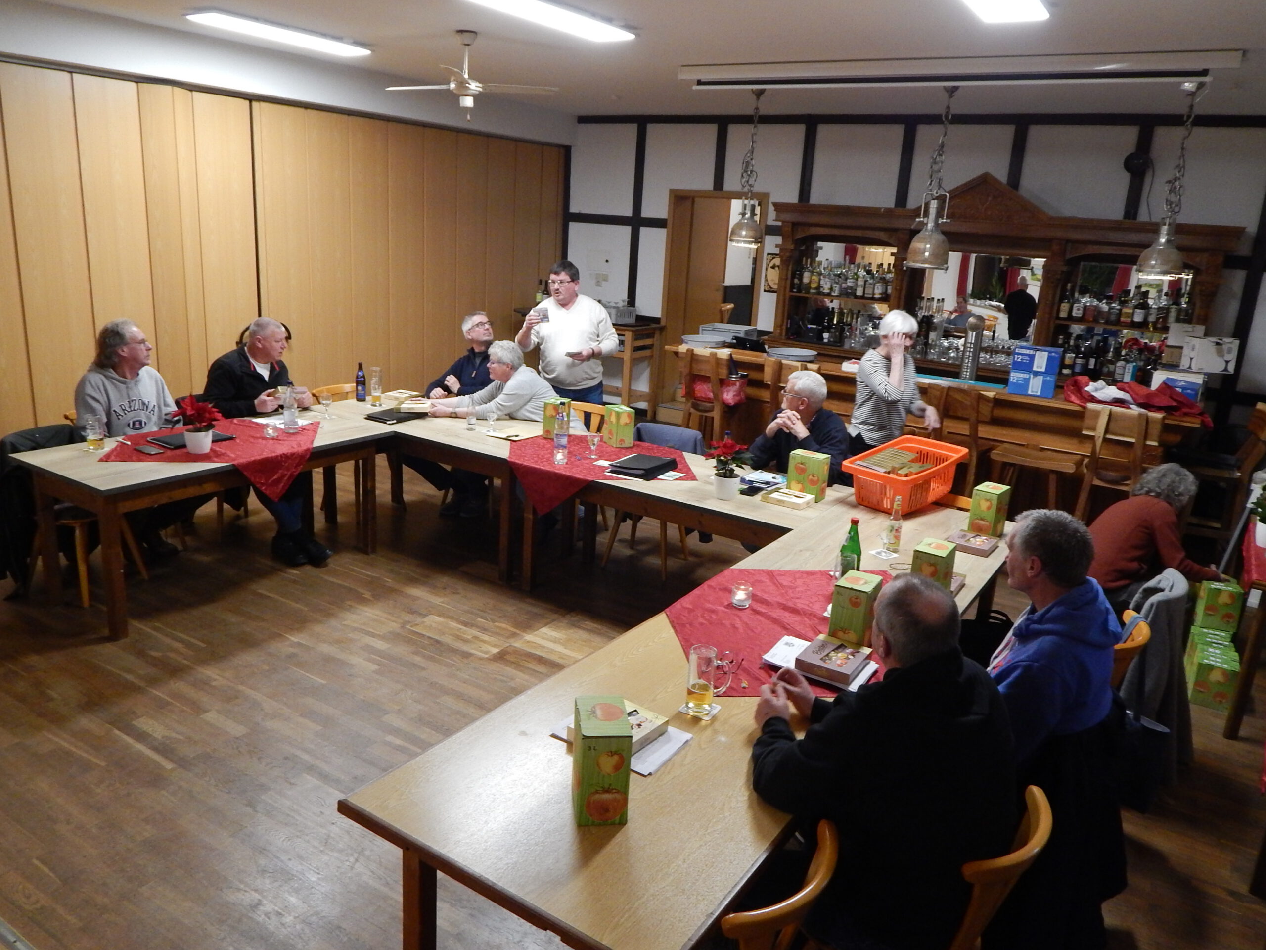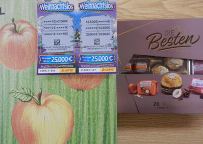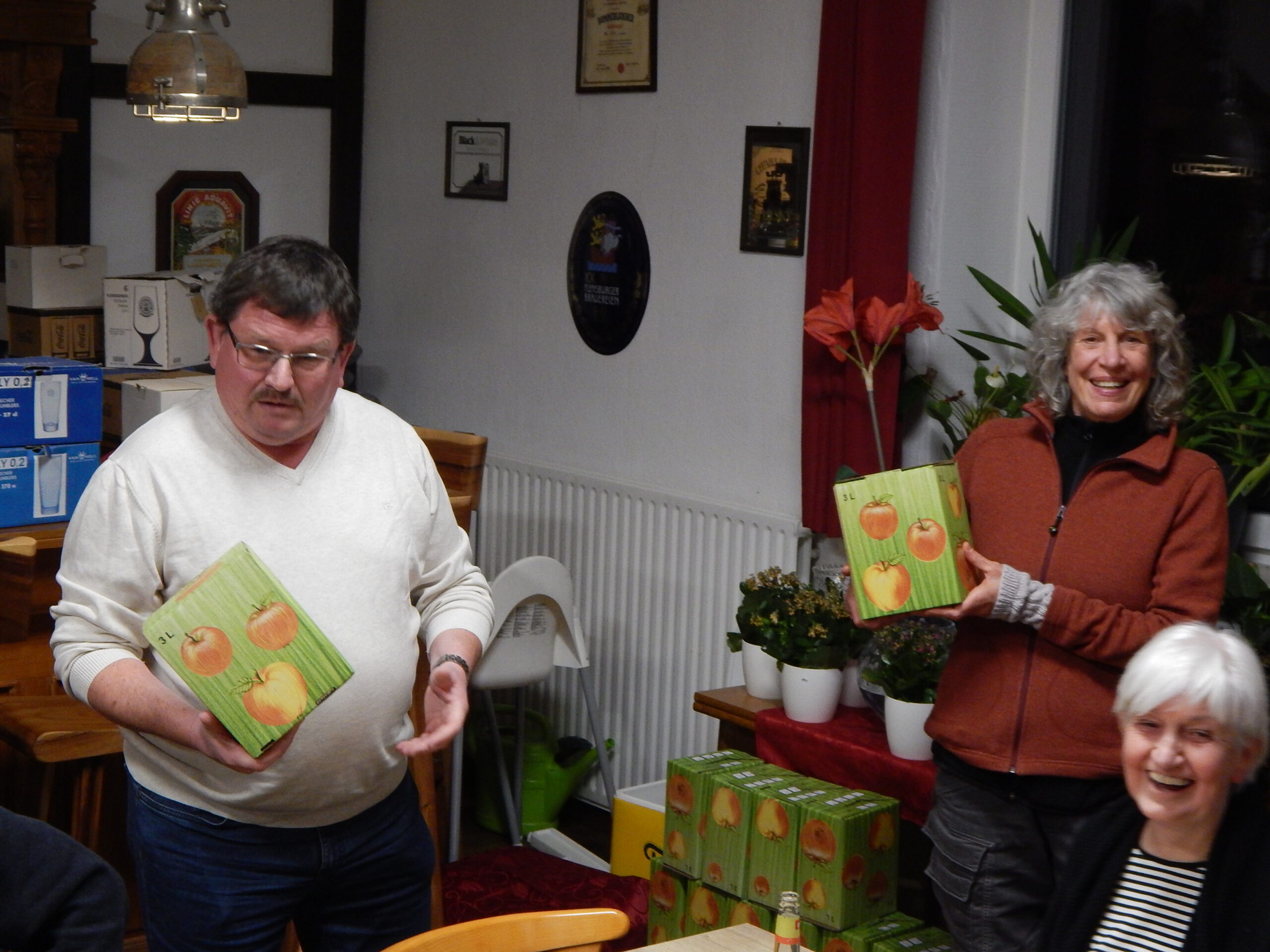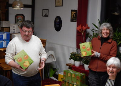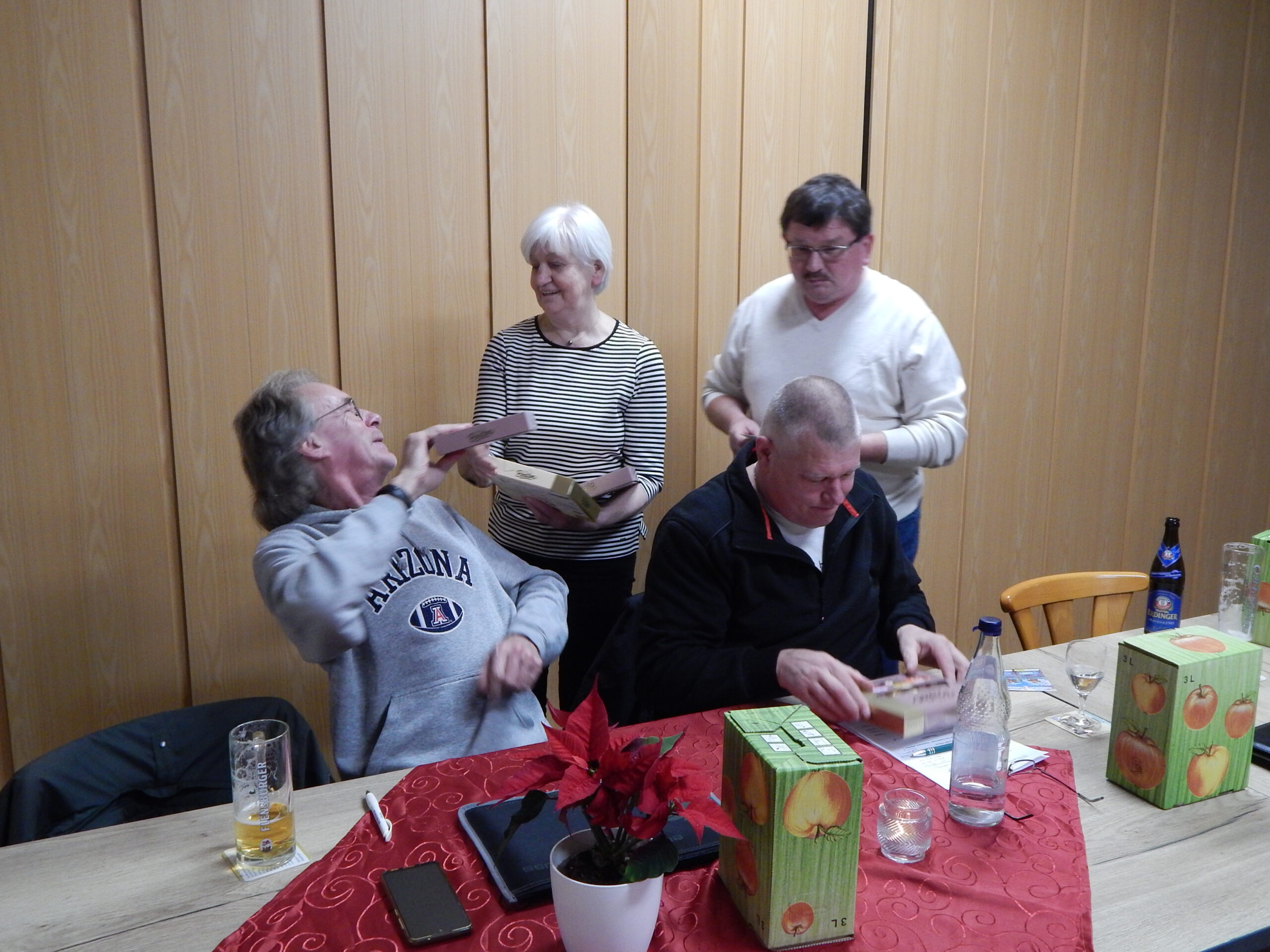 Mit einem Dank für die einvernehmliche und erfolgreiche Arbeit in diesem Jahr schloss Bürgermeister Kai Börensen die Sitzung und machte gleich mit Geschenken weiter: Er verteilte Apfelsaft aus der reichen Ernte des Gemeindebestands am Paleg und im Süderende, Pralinen und Weihnachtslose mit der (leider vergeblichen) Chance auf einen satten Geldgewinn.