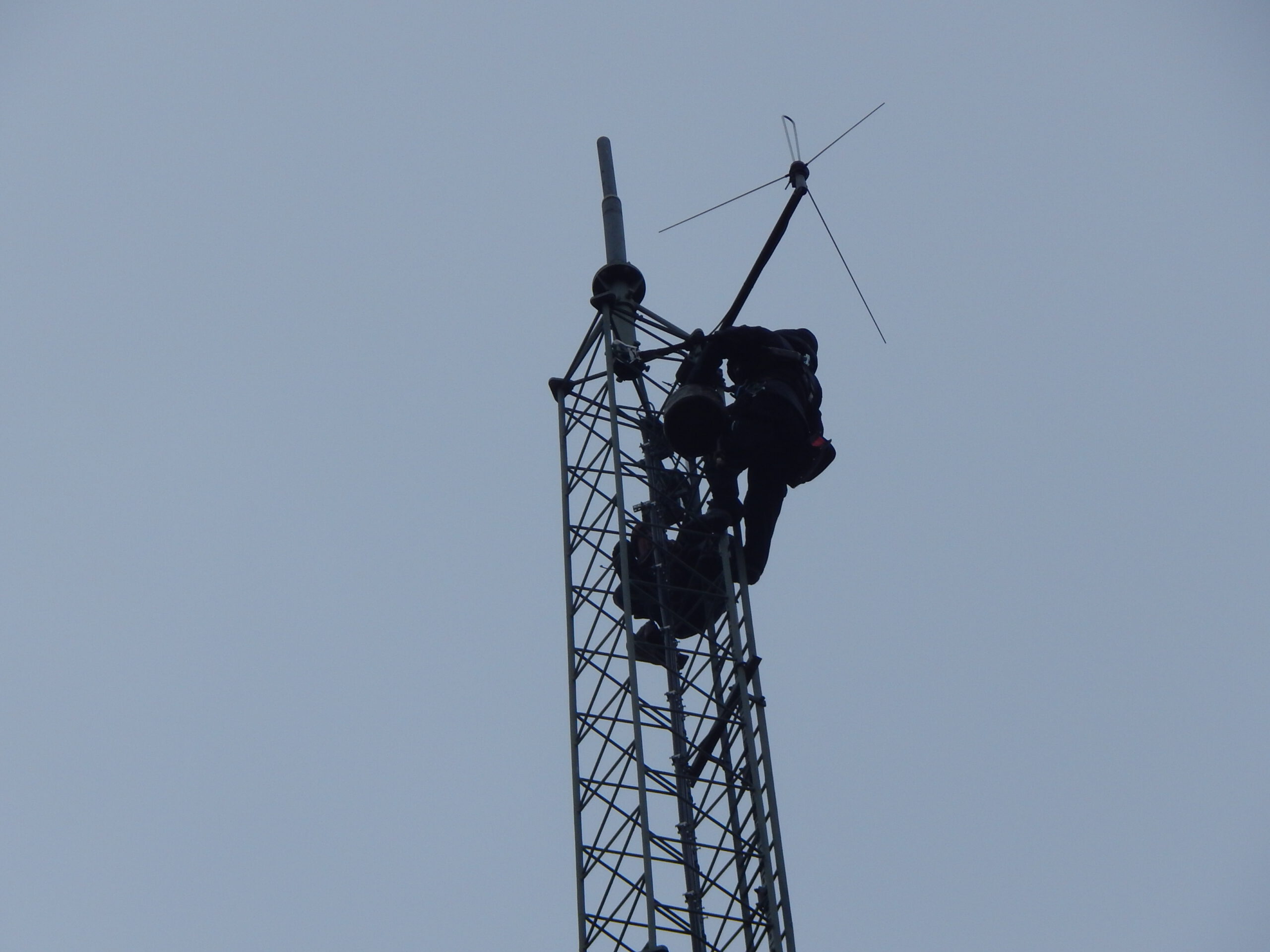 Hier ist die Lösung: Im Auftrag der Eigentümerin dieses 52m hohen Gittermastes, der Schleswig-Holstein Netz AG, waren zwei Mitarbeiter einer Firma aus Büdelsdorf damit beschäftigt, die jährlich vorgeschriebene Prüfung der Sicherheit bei den Aufstiegelementen vorzunehmen und dabei gleich eine Störung in der oben sitzenden Antenne zu beseitigen.