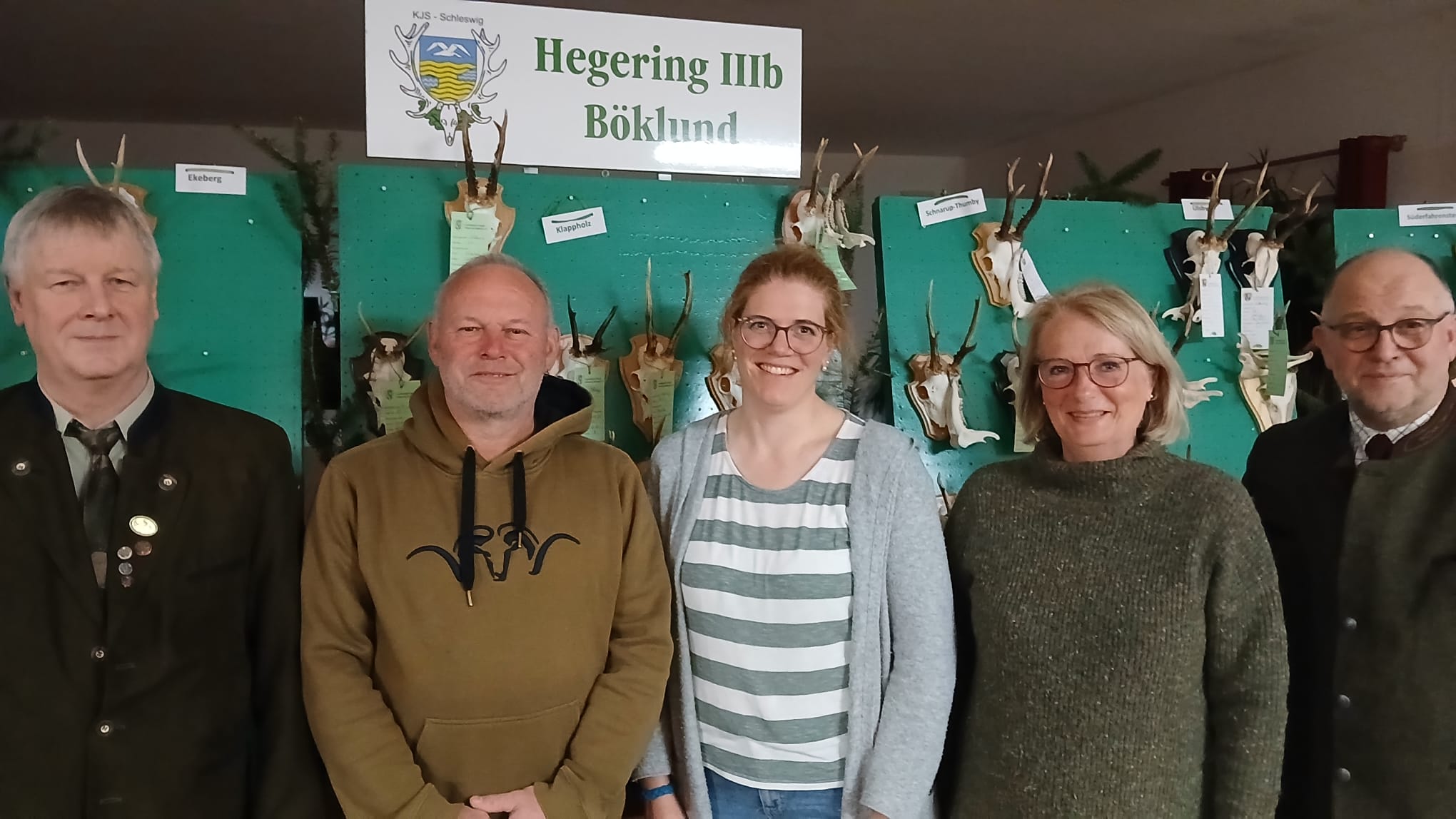 Auch in anderen Punkten spielte das Revier Stolk eine tragende Rolle: So wurde bei den Vorstandswahlen Nina Bendixen als Kassenwartin einstimmig wiedergewählt. Unser Foto zeigt sie mit den ebenfalls Bestätigten Hegeringleiter Bernd Gorr, Hundewart Frank Hönsch, dessen Stellvertreterin Maike Jantzen und Wahlleiter Dr. Heinz Rohling als Vorsitzender der Kreisjägerschaft Schleswig.