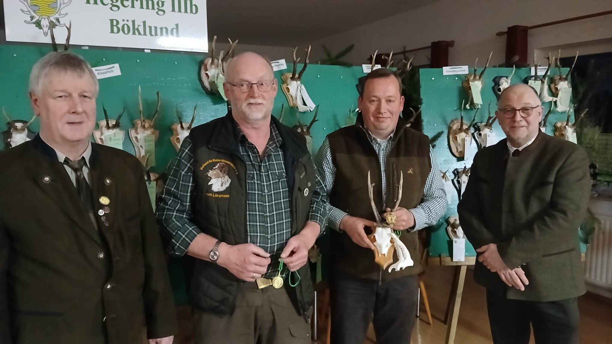 Stolk kam weiterhin „groß raus“ beim Hegering-Pokalschießen mit dem Sieg als Mannschaft und Rayk Mordhorst als sicherstem Einzelschützen. Obendrein gewann Holger Mordhorst mit seiner Hündin Caro (Rasse „Kleiner Münsterländer“) die Pokalsuche auf Hegering-Ebene, und zu guter Letzt erhielt das Revier Stolk nach Bewertung der ausgestellten Gehörne die Hegemedaille in Gold für eine sehr gute Rehwildbejagung. Auf dem Foto steht Holger Mordhorst stellvertretend für die Stolker Jäger neben Christian Rausch aus Ekeberg, der den besten Rehbock erlegt hat, und Hegeringleiter Bernd Gorr sowie dem Kreisgruppen-Vorsitzenden Dr. Heinz Rohling.