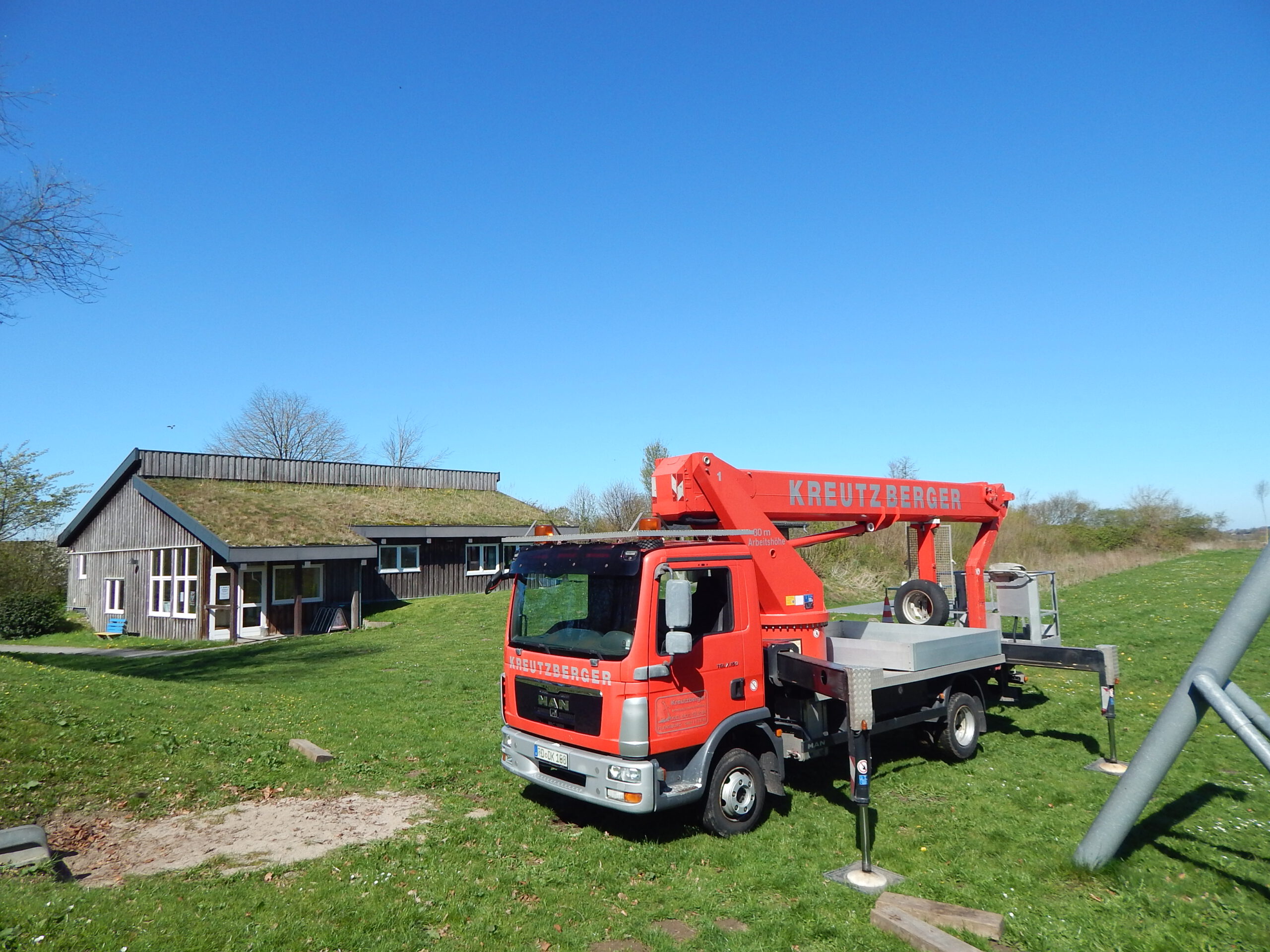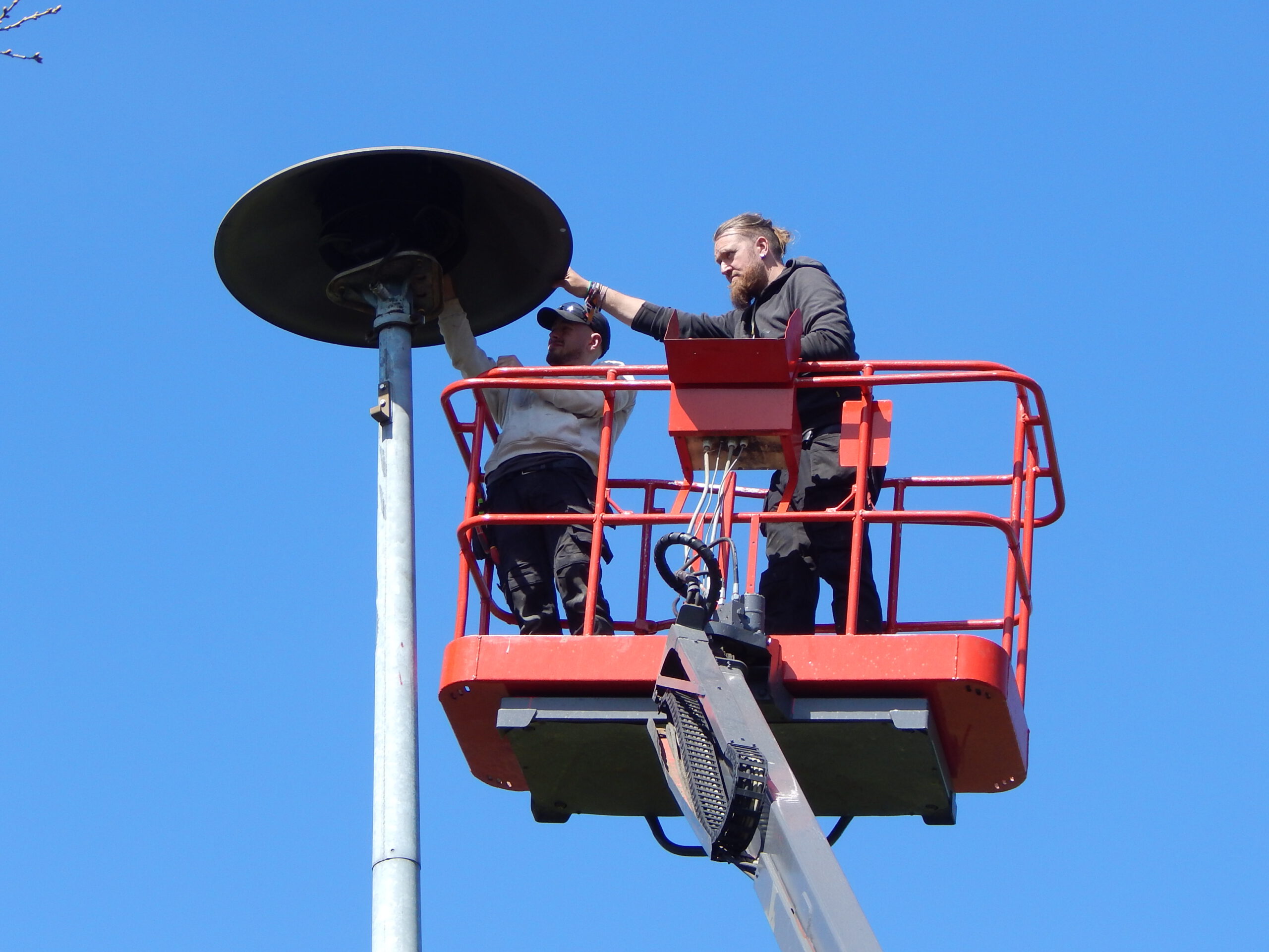 Schließlich kamen die Monteure zwei Tage später wieder mit der firmeneigenen selbstfahrenden Hubbühne. Das klappte auf Anhieb. Dabei war neben fehlender Höhenangst Körperkraft gefragt, um den verklemmt festsitzenden alten knapp 60kg schweren Motorblock sicher zum Boden zu bringen.
