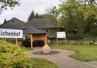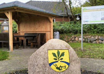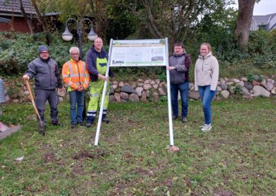 Kenner unseres Dorfes sehen sofort: Auf dem „Platz am Eichenhof“ gibt es etwas Neues. Seit vorgestern steht dort eine Infotafel. Unser zweites Foto zeigt (v.li.), wer am Vormittag beim Aufstellen dabei war: Ein Mitarbeiter der Firma Vektor-Grafik aus Kappeln, die die Infotafel am vergangenen Freitag gedruckt hat, Gemeindearbeiter Reiner Haß, Bauausschuss-Vorsitzender Hartmut Kühl, Bürgermeister Kai Börensen und Keke Marie Vangerow vom Fachgebiet Radreiseregion und Infrastrukturmanagement der Tourismusgesellschaft Ostseefjord Schlei GmbH.