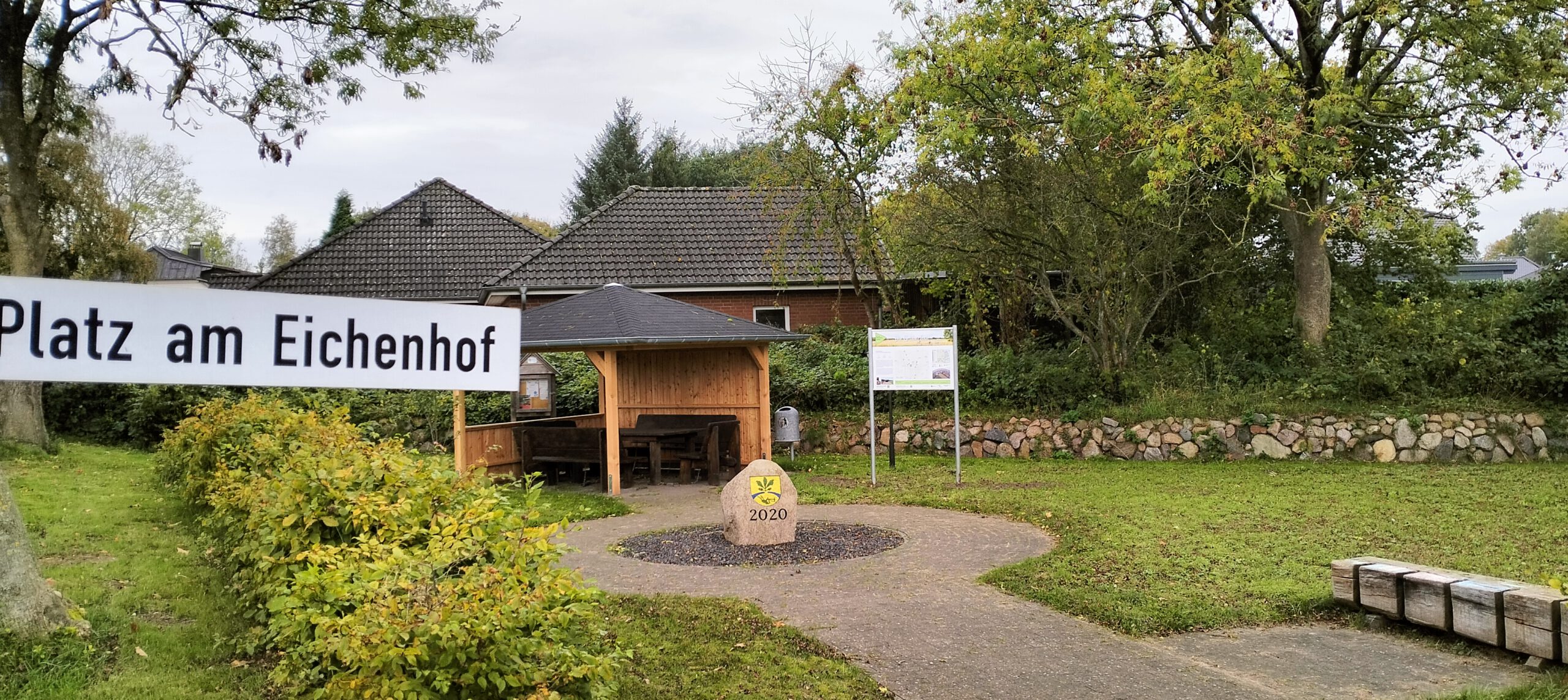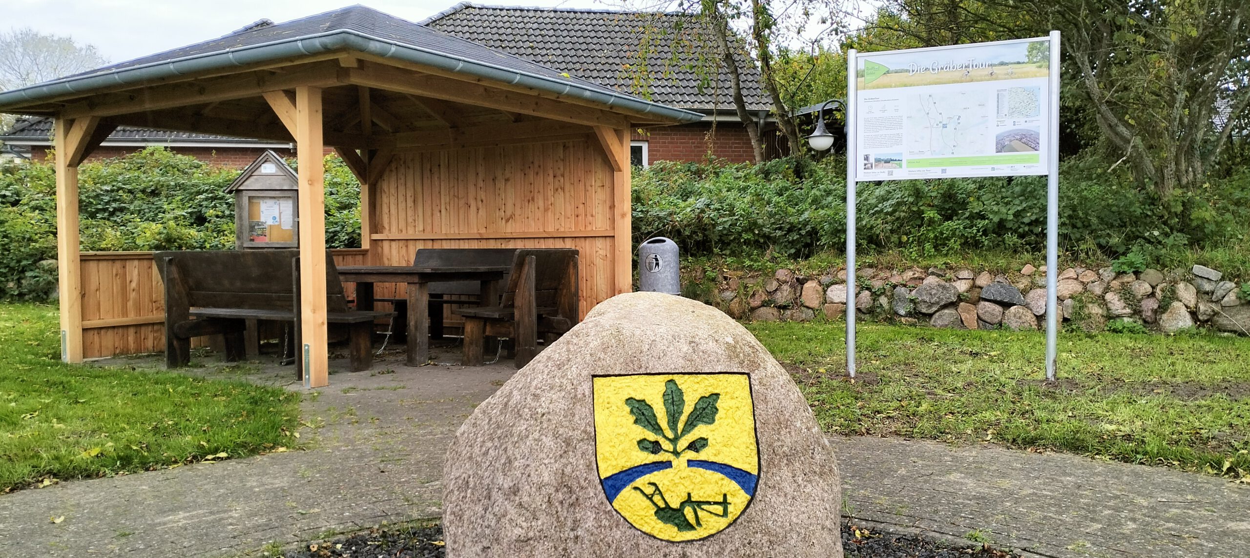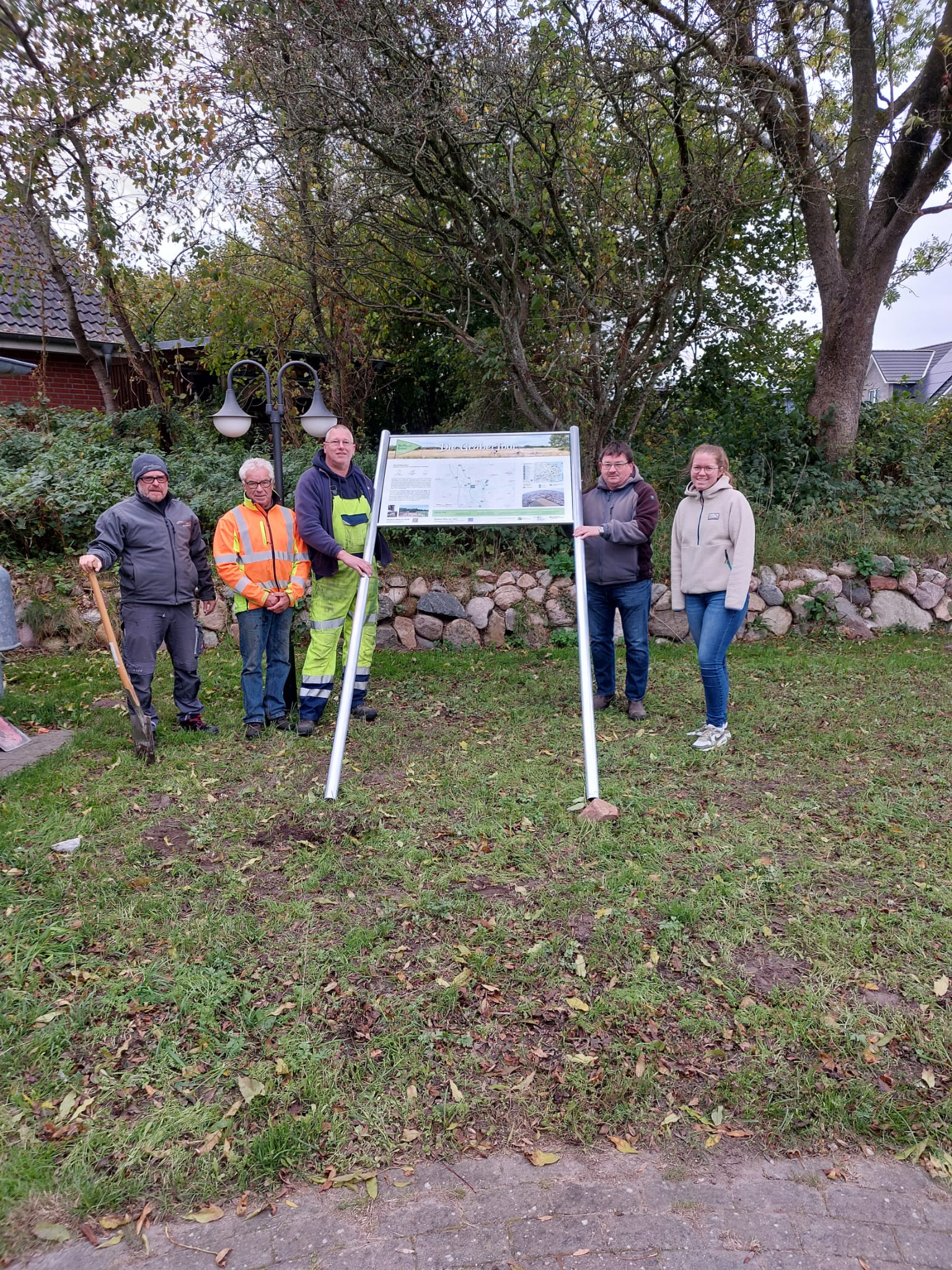 Kenner unseres Dorfes sehen sofort: Auf dem „Platz am Eichenhof“ gibt es etwas Neues. Seit vorgestern steht dort eine Infotafel. Unser zweites Foto zeigt (v.li.), wer am Vormittag beim Aufstellen dabei war: Ein Mitarbeiter der Firma Vektor-Grafik aus Kappeln, die die Infotafel am vergangenen Freitag gedruckt hat, Gemeindearbeiter Reiner Haß, Bauausschuss-Vorsitzender Hartmut Kühl, Bürgermeister Kai Börensen und Keke Marie Vangerow vom Fachgebiet Radreiseregion und Infrastrukturmanagement der Tourismusgesellschaft Ostseefjord Schlei GmbH.