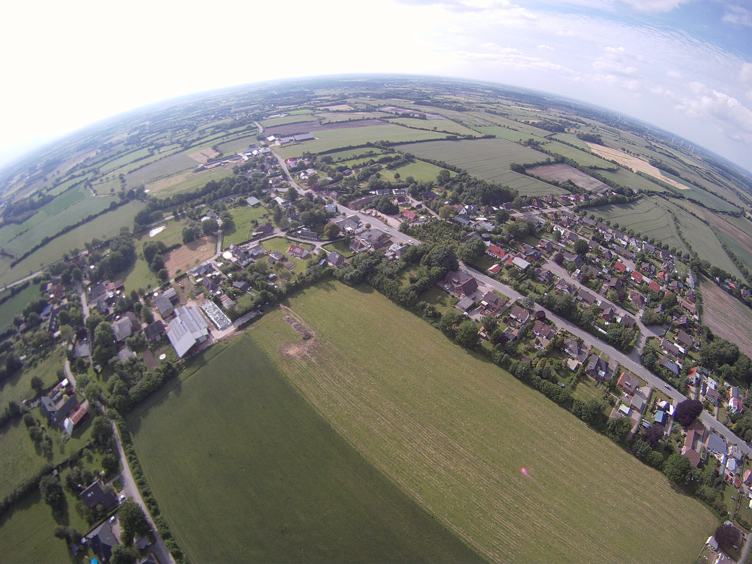Weil die Karte bestehende Radrouten zeigen soll, hat der Stolker Johannes Jessen die Rundtour zu den Gräbern von 1850 eingearbeitet. Völlig überstürzt sollte unsere Redaktion ein Foto von Stolk liefern. An herbstgrauen Tagen war kein ansprechendes Motiv abzulichten, und so kam das hier gezeigte Luftbild von Oberstolk gen Westen auf die Tafel.