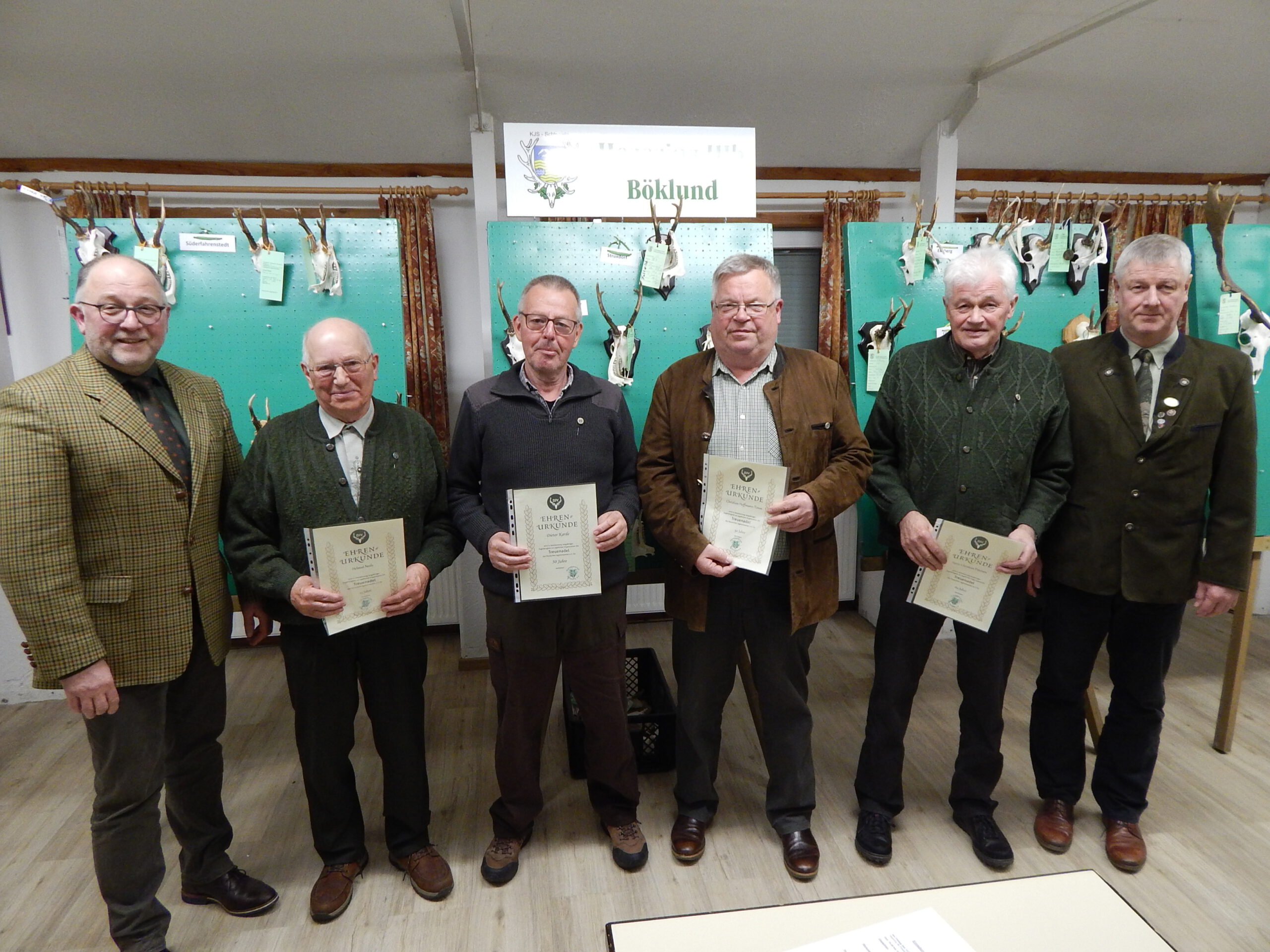 Wegen einer Lichtspiegelung kann man auf dem Schild oben nicht lesen „Hegering IIIb“. Dieser hatte seine Jahreshauptversammlung am 12. April im „Dörps- un Schüttenhus“ Hollmühle. Dabei wurden vom stellv. Vorsitzenden der Kreisjägerschaft Schleswig, Dr. Roling, und von Hegeringleiter Bernd Gorr vier Jäger für jahrzehntelange Mitgliedschaft mit Ehrenurkunde und Treuenadel ausgezeichnet.