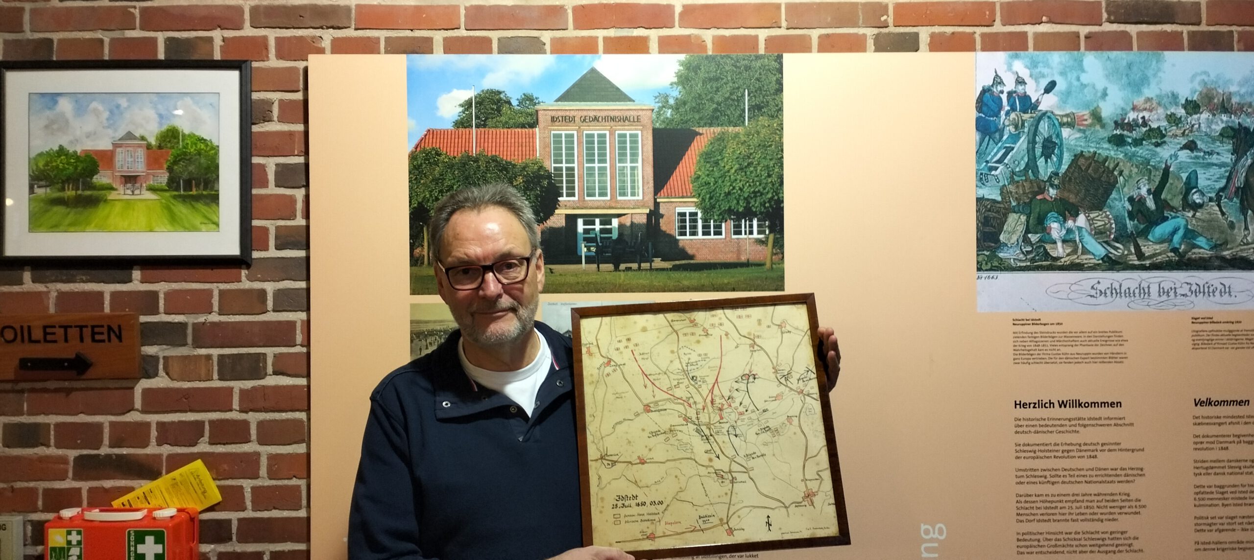 Als Peter Thoröe den Gasthof 1994 verkaufte, gelangte das historische Werk in Privatbesitz. Im vergangenen Jahr übergab Peters Tochter Rita die Geschichtskarte unserem Kulturausschuss-Vorsitzenden. Anlässlich einer Vorstandssitzung des Fördervereins der Gedächtnishalle in der vergangenen Woche kam das Exponat in die Hände des Vorsitzenden Johannes Jessen. Der Stolker ist zugleich im Vorstand der Idstedt-Stiftung, und die wird entscheiden, ob das „gute Stück“ in das künftige Ausstellungskonzept passt.