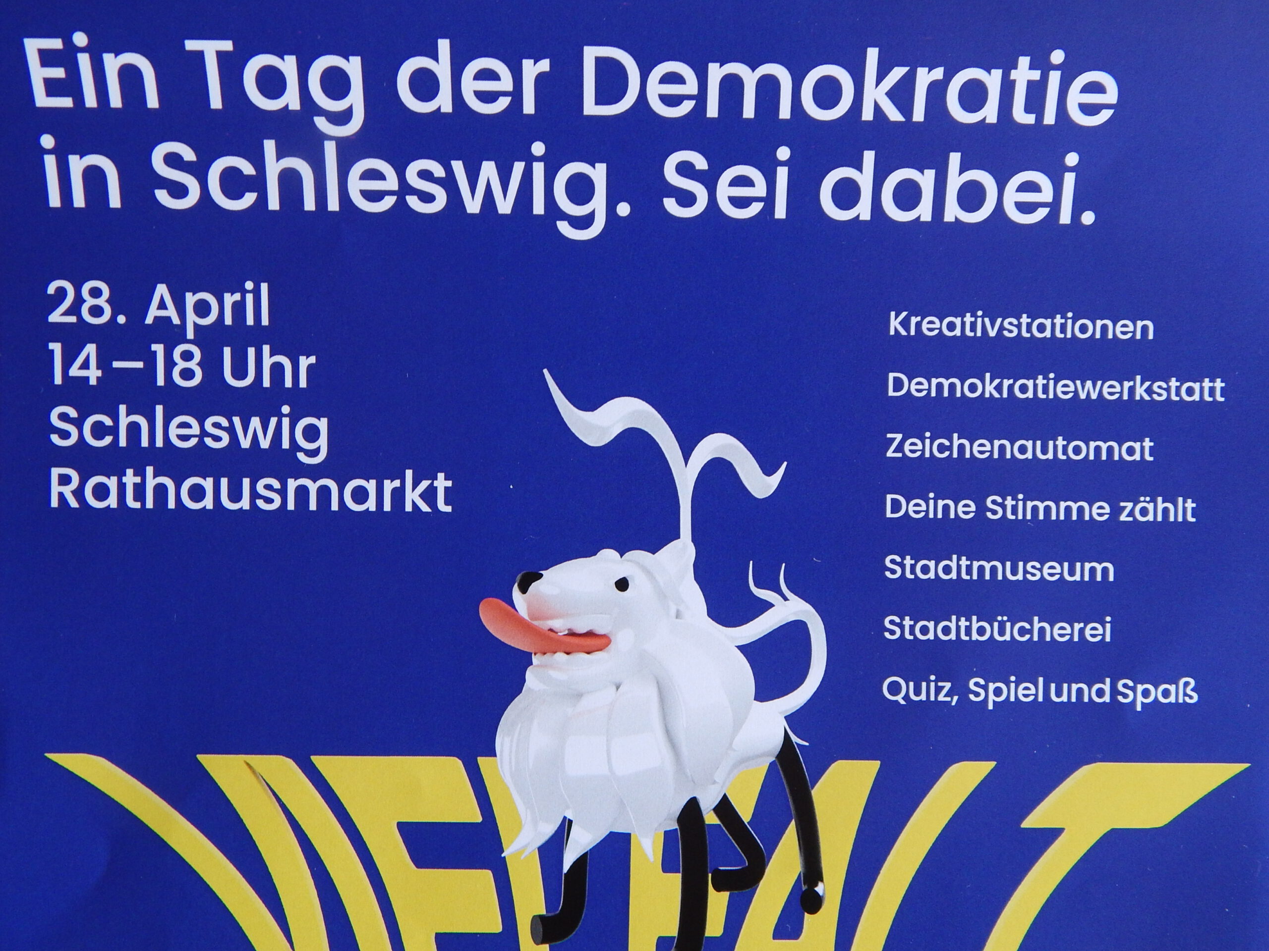 Im vergangenen Juli war das Mobil schon einmal in unserer Nähe, nämlich anlässlich der Feierlichkeiten zum 175-jährigen Gedenken an die Schlacht bei Idstedt auf dem Gelände neben dem Museum in Idstedtkirche. In diesem Jahr konnten sich Gemeinden für den Besuch bewerben aufgrund der Verleihung des Bürger- und Demokratiepreises an alle ehrenamtlichen Bürgermeister. Daraufhin wurden die Zielpunkte des Mobils per Los bestimmt, und so ist die erste Anlaufstelle Schleswig, wo auf dem Rathausmarkt viel geboten wird zum wichtigen Thema „Demokratie“.