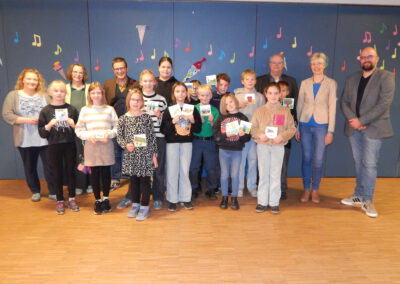 Unser Gruppenfoto zeigt einige Fünftklässler sowie (v.re.) Schulleiter Tim Petersen, Karen Nehlsen vom Ministerium, Schulverbandsvorsteher Dr. Dierk Martin, Jens Schemschat vom Ministerium, Schulrätin Kerstin Engels und Dänisch-Lehrerin Maylinn Rohde.