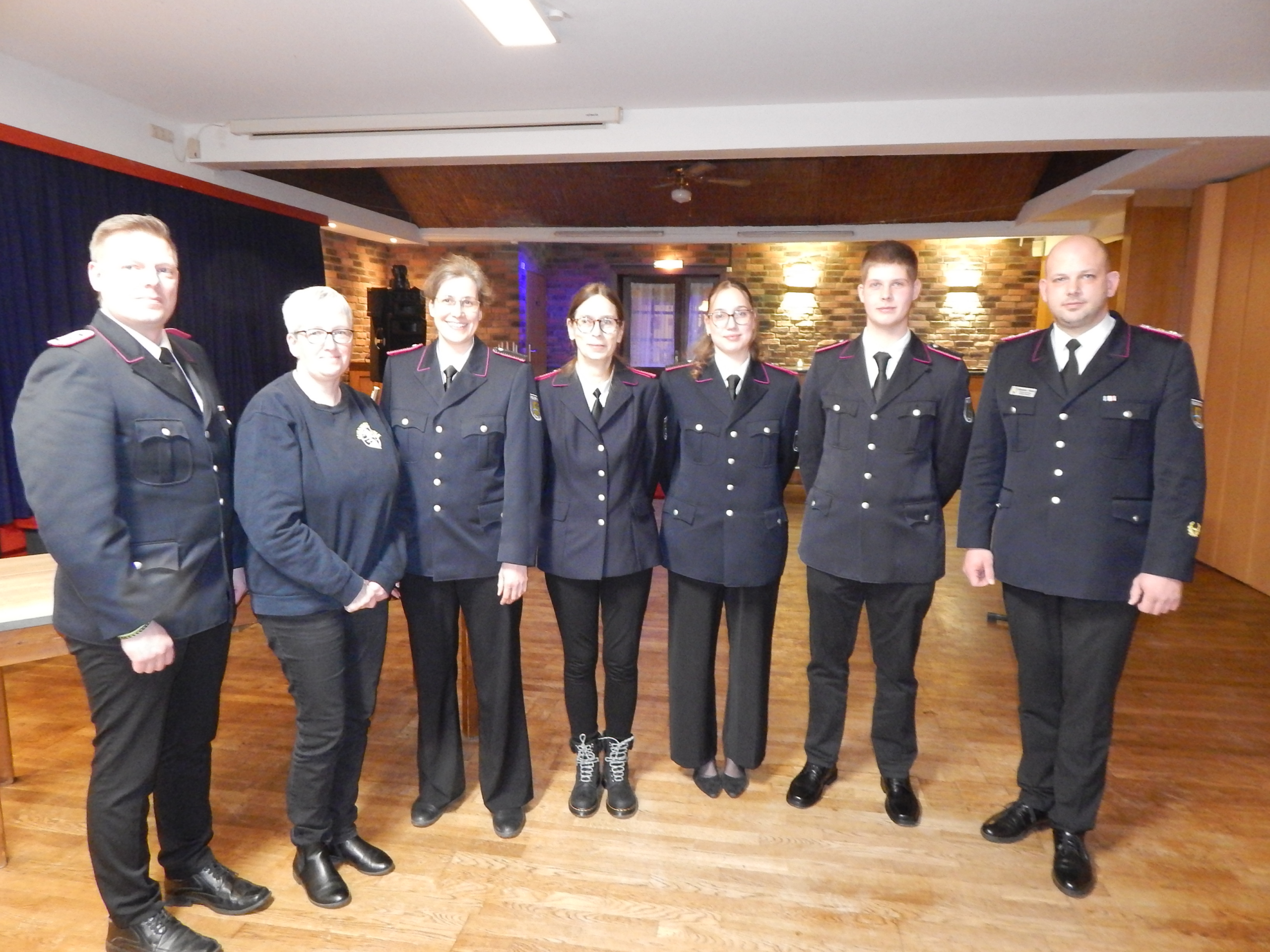 TOP 7 bei der Jahreshauptversammlung unserer Freiwilligen Feuerwehr in der vergangenen Woche brachte Erfreuliches: Die seit Monaten laufende Werbeaktion um neue Aktive in der Einsatzabteilung hatte mit vier Neuzugängen Erfolg. Gemeindewehrführer Alexander Hansen (re.) und sein Stellvertreter Sven Boysen (li.) nahmen als Anwärter auf Svenja Rosbander (3.v.li.), Susanne Kretschmann (Mitte), Jessica Schulz (3.v.re.) und Tarek Petersen (2.v.r.). Stolz äußerte sich Hauptbrandmeister Alexander Hansen über drei weitere Frauen: „Im Umkleideraum der Frauen ist nur noch ein Spind frei. Der muss auch noch belegt werden.“