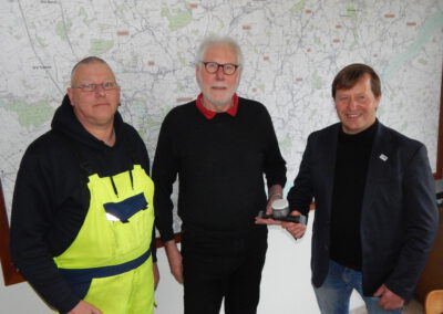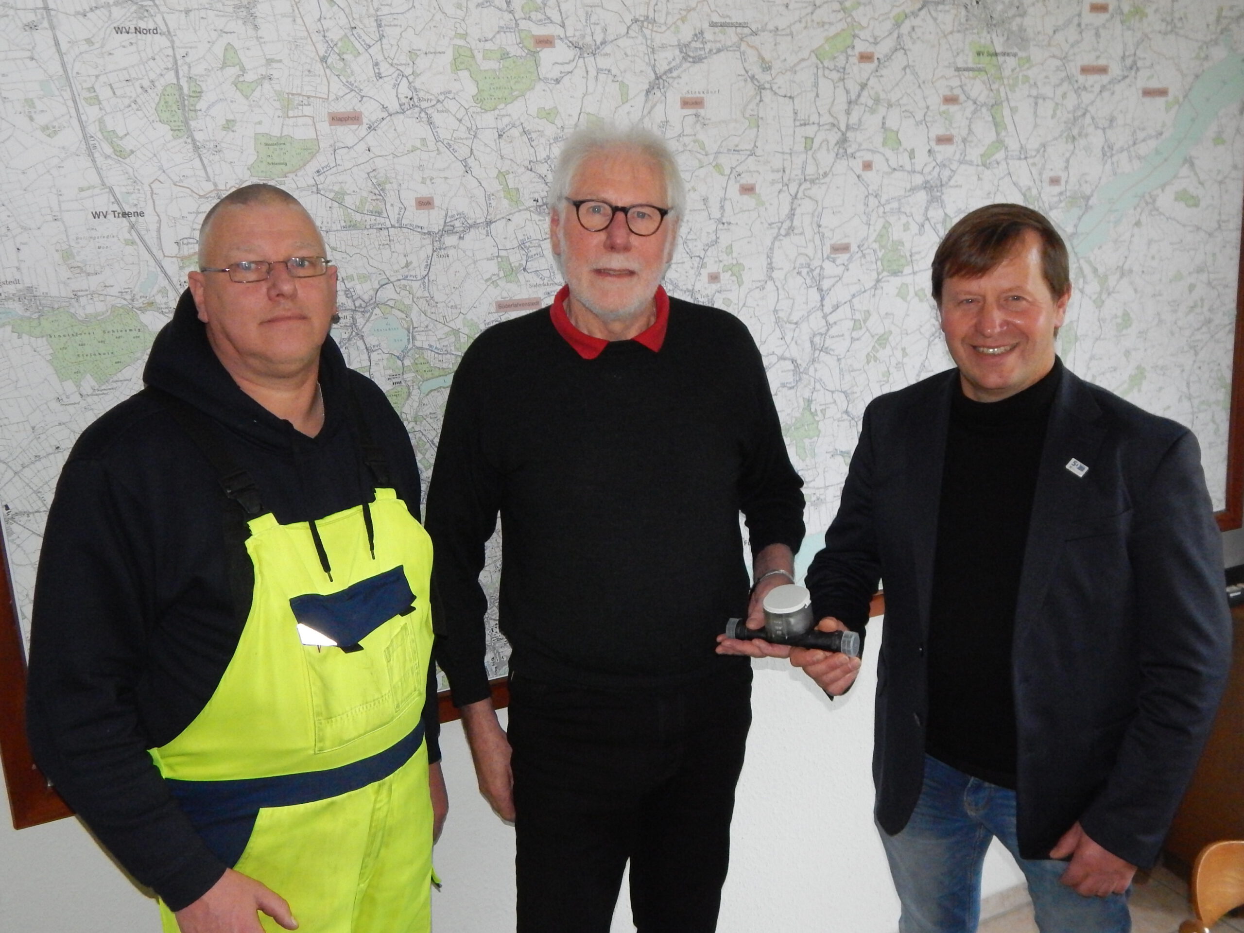 Unser Foto zeigt Jens Uwe Hansen aus Plön von der Firma Heitland in Solingen, der im Beisein des technischen Wasserwerk-Chefs Hartmut Kühl dem Verbandsvorsteher Johannes Petersen ein erstes Exemplar der neuen Serie überreicht.