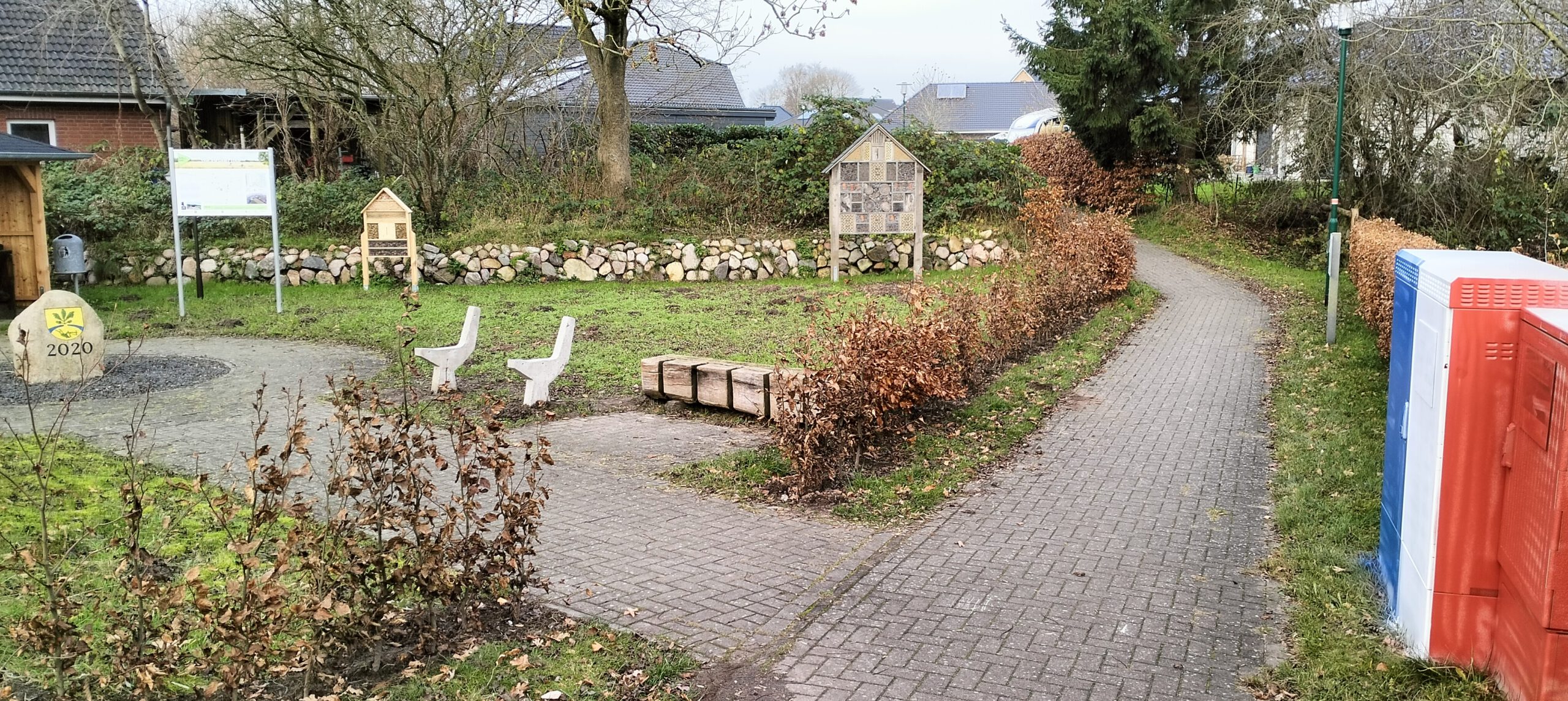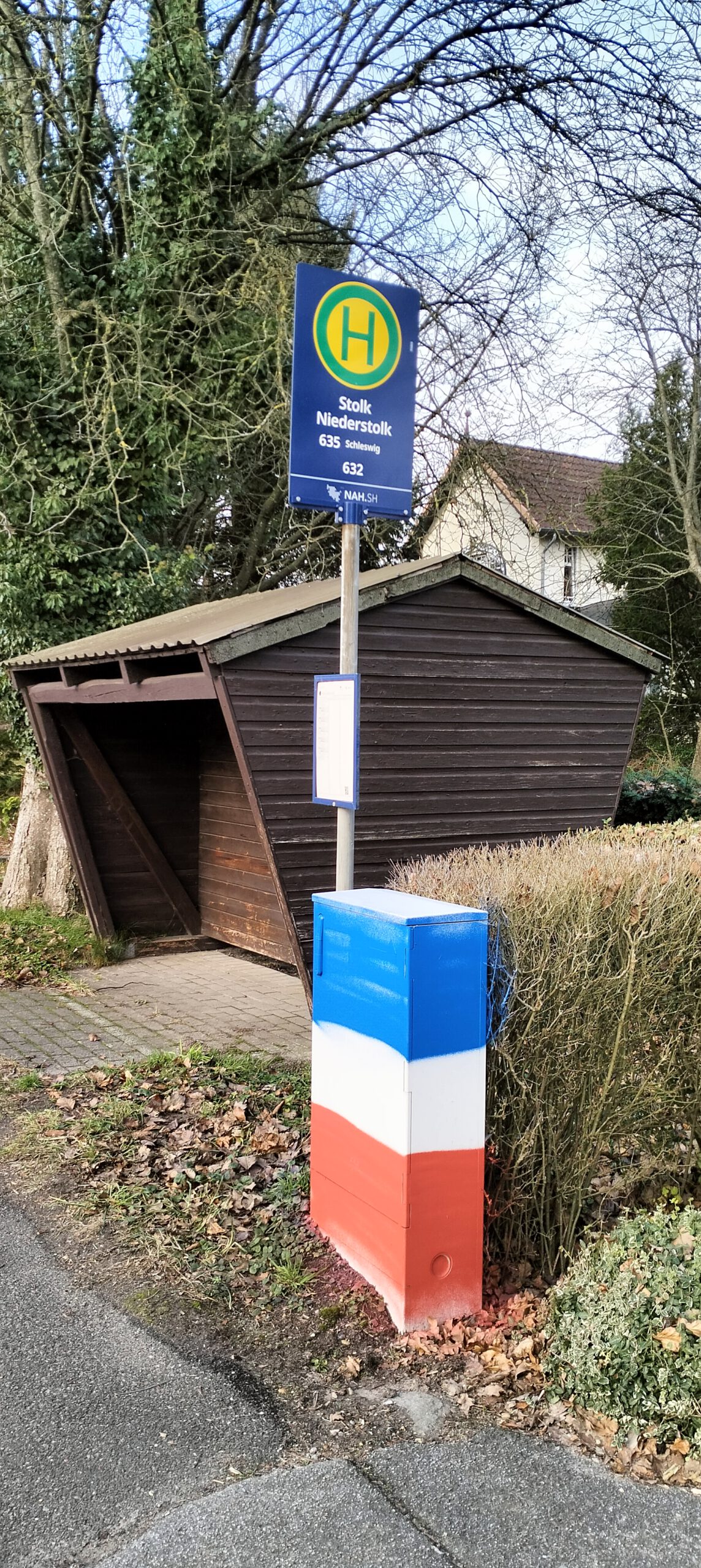 Schaut man sich die anderen Schaltkästen entlang der Hauptstraße an (einen auch in der Nacht zum 3. Dezember gestalteten zeigen wir), könnte man ebenso denken, der Graffitti-Lehrling sei ein bekennender Schleswig-Holsteiner. Das wäre ja da, wo es optisch hinpasst, gar nicht übel. Nur – warum hat der Landesfanatiker ausgerechnet unseren geselligen Dorfplatz zur französischen Besatzungszone erklärt?!