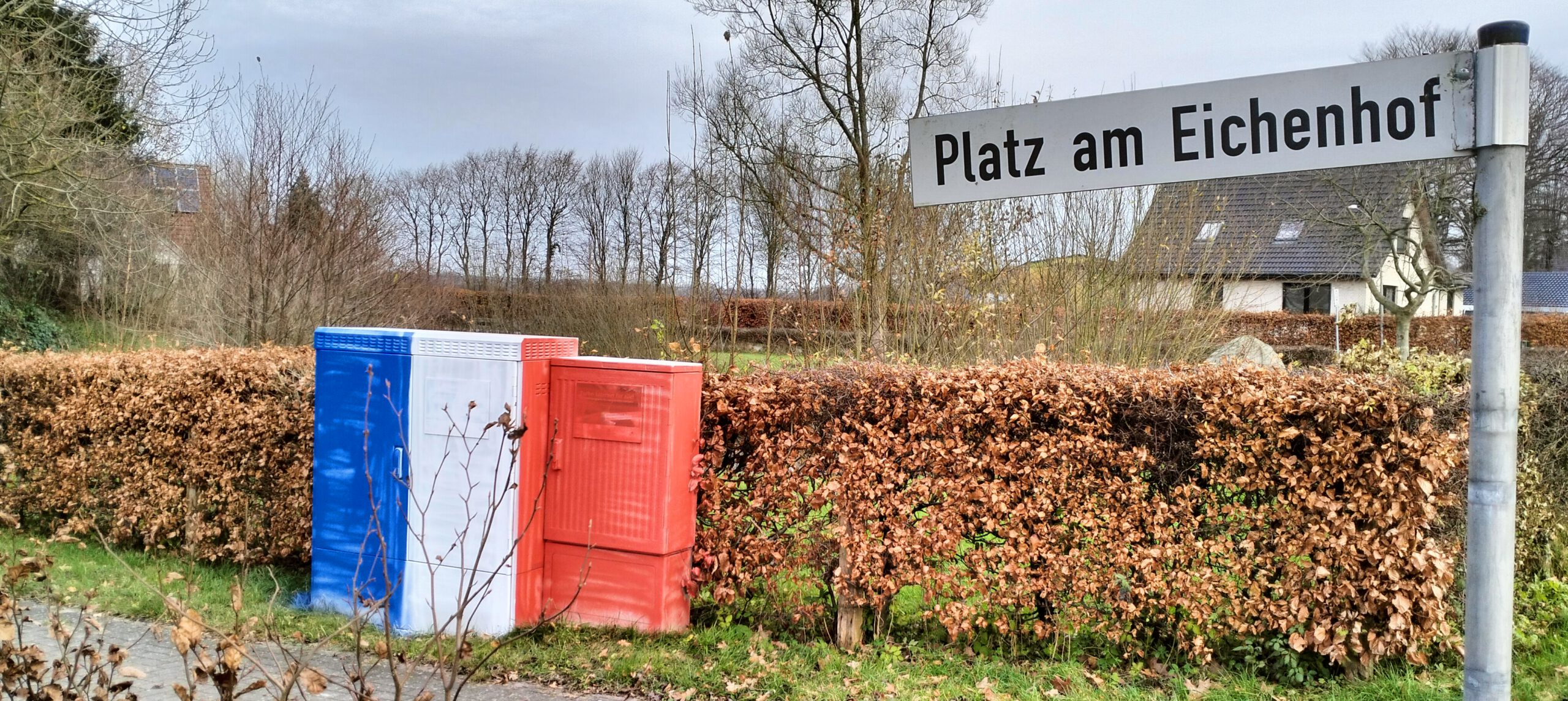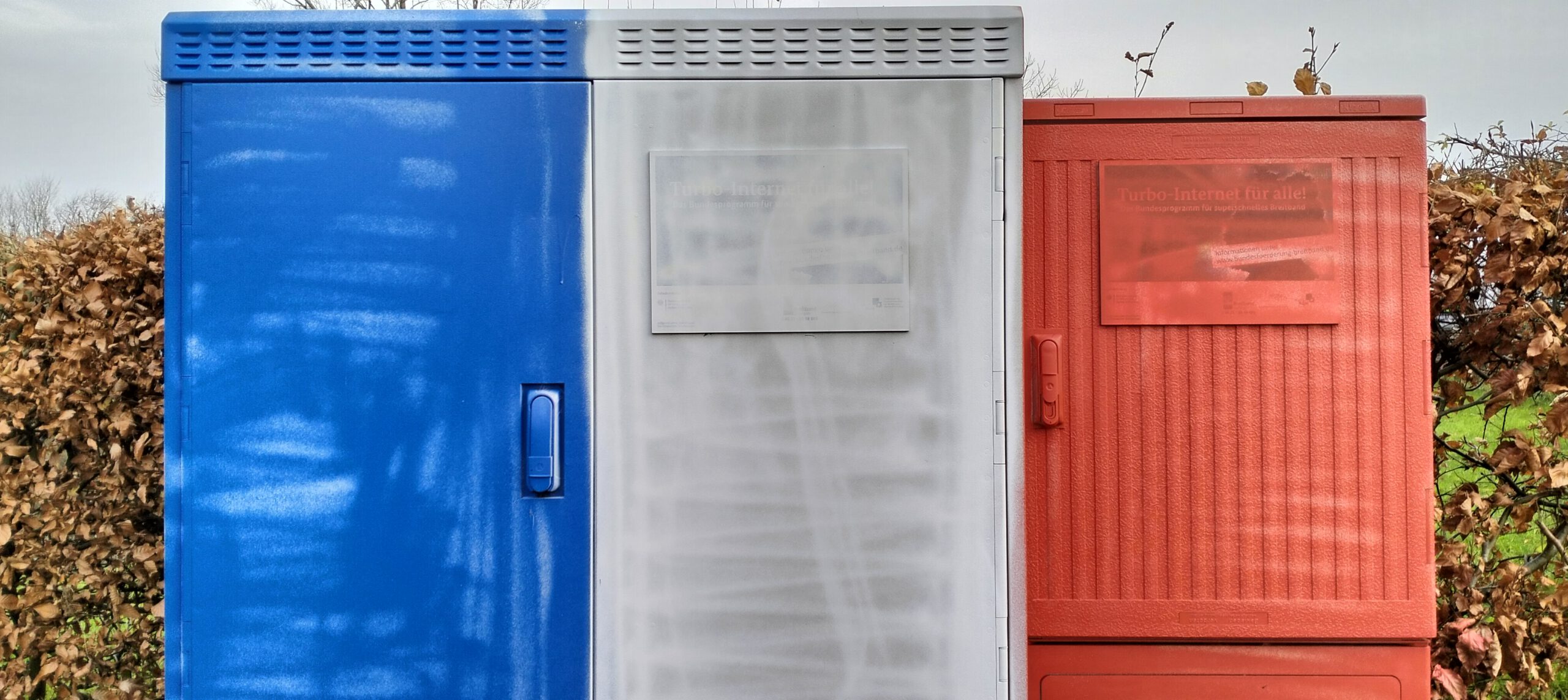 Was schon seit Monaten an der Landesstraße 28 außerorts zu sehen war, hat uns in der Nacht zu vorgestern auch im Ortskern heimgesucht: Die Verteilerkästen für Strom und Glasfaser sind seitdem blau-weiß-rot.