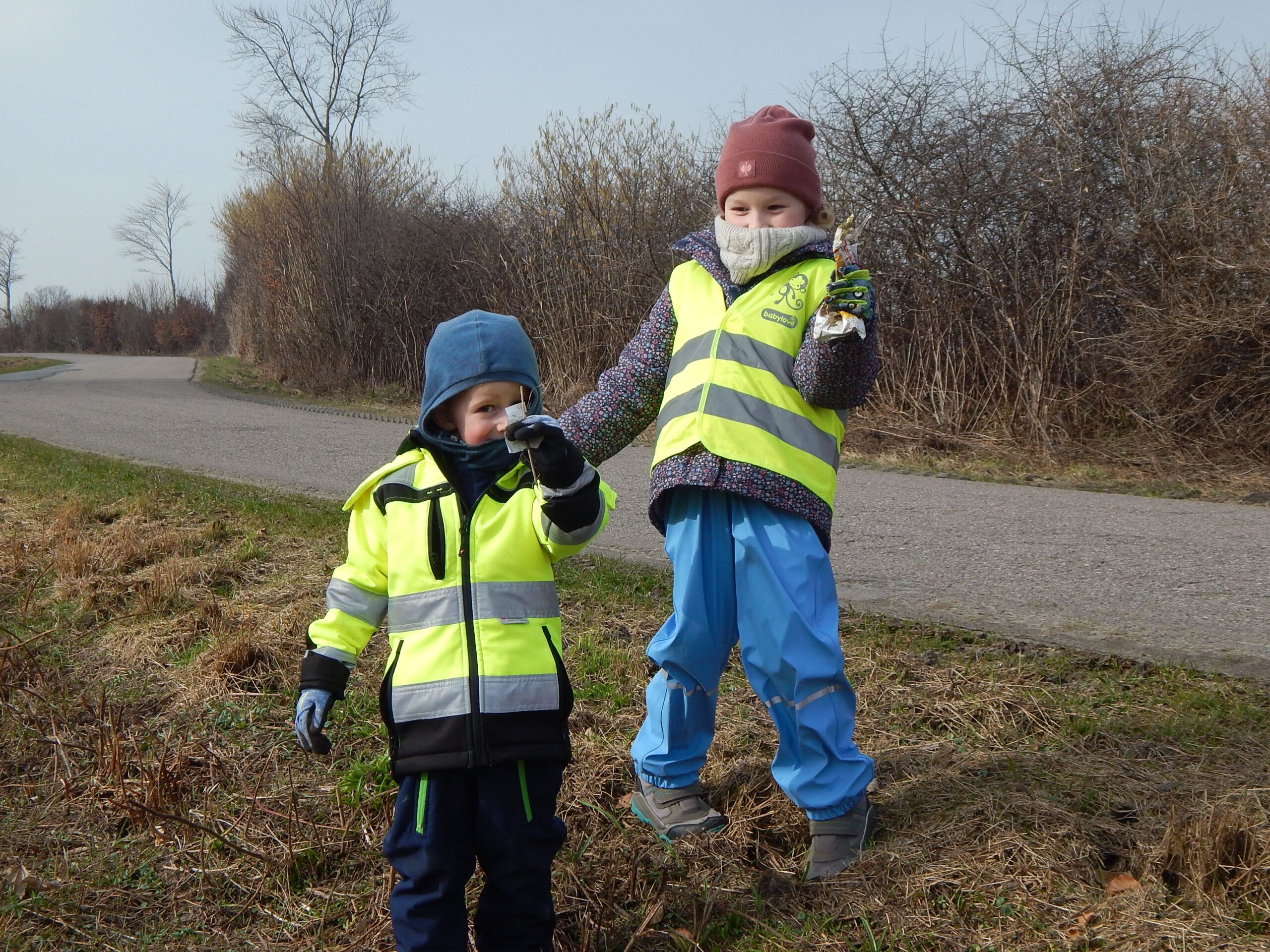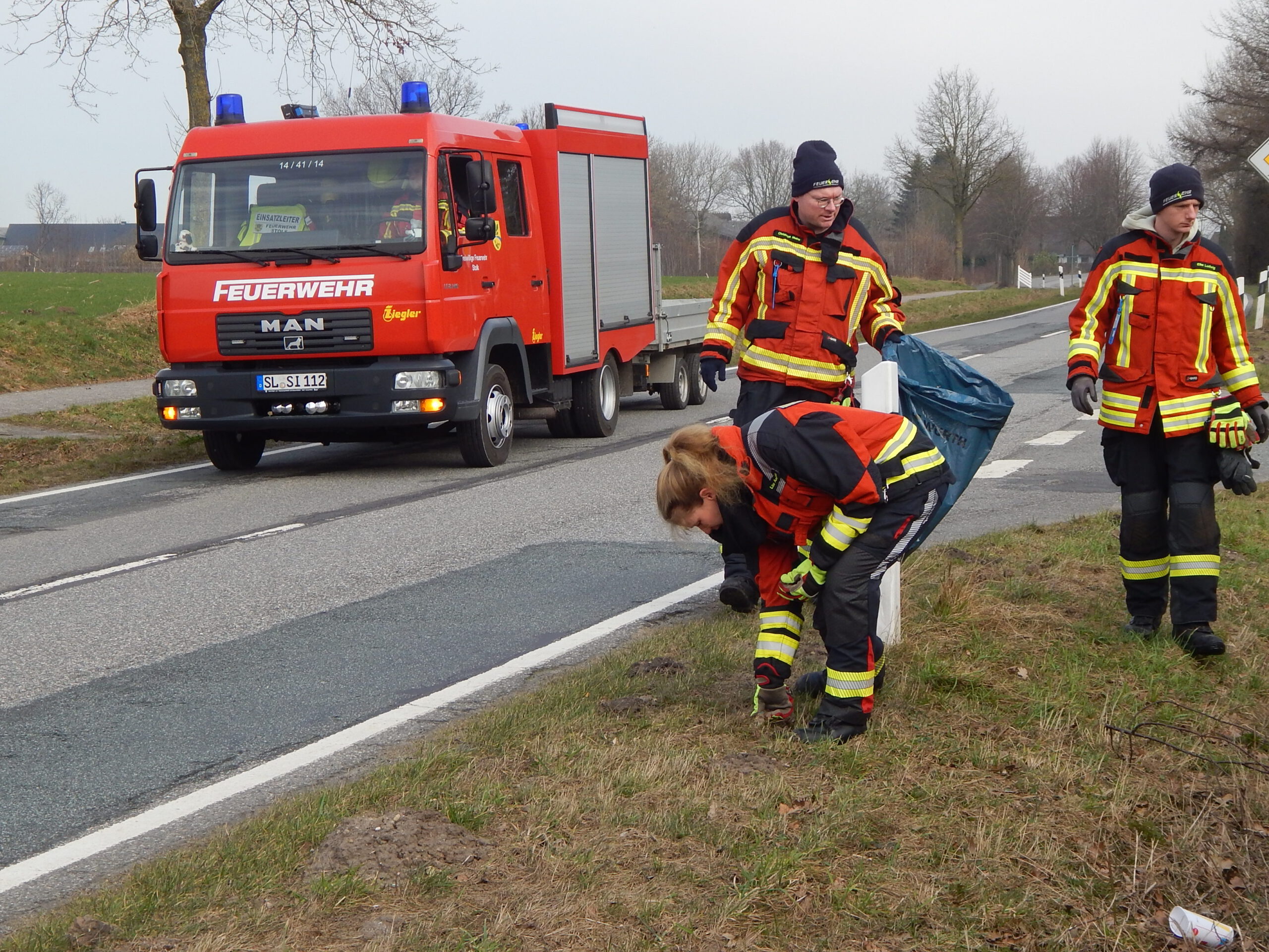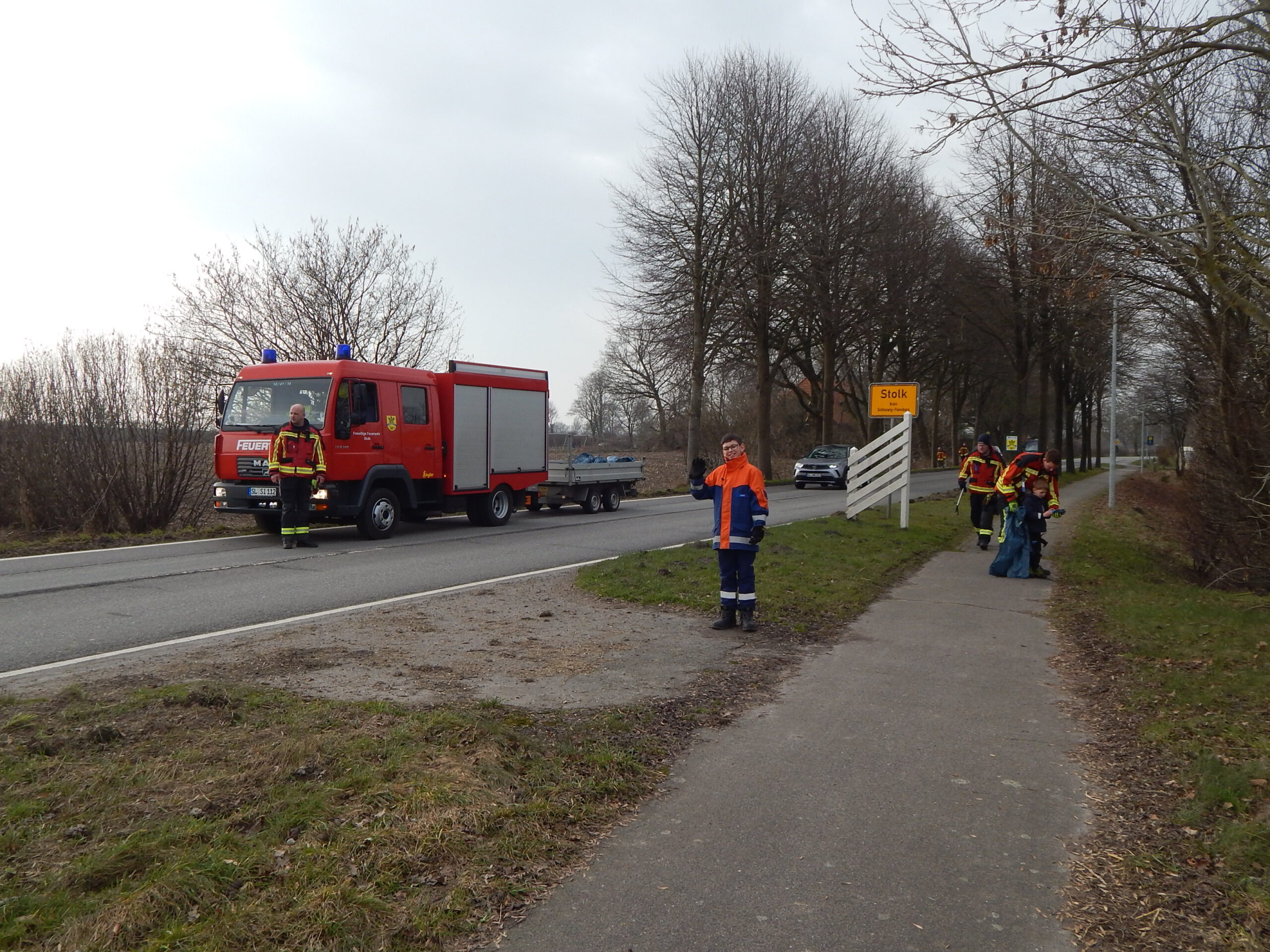 Wie immer sicherte unsere Freiwillige Feuerwehr die Müllsammler an der Landesstraße. Dort und an der Kreisstraße durch Stolkerfeld lag wie in den Vorjahren der meiste Müll. Flaschen und Verzehrpackungen fliegen offensichtlich aus den Autos.