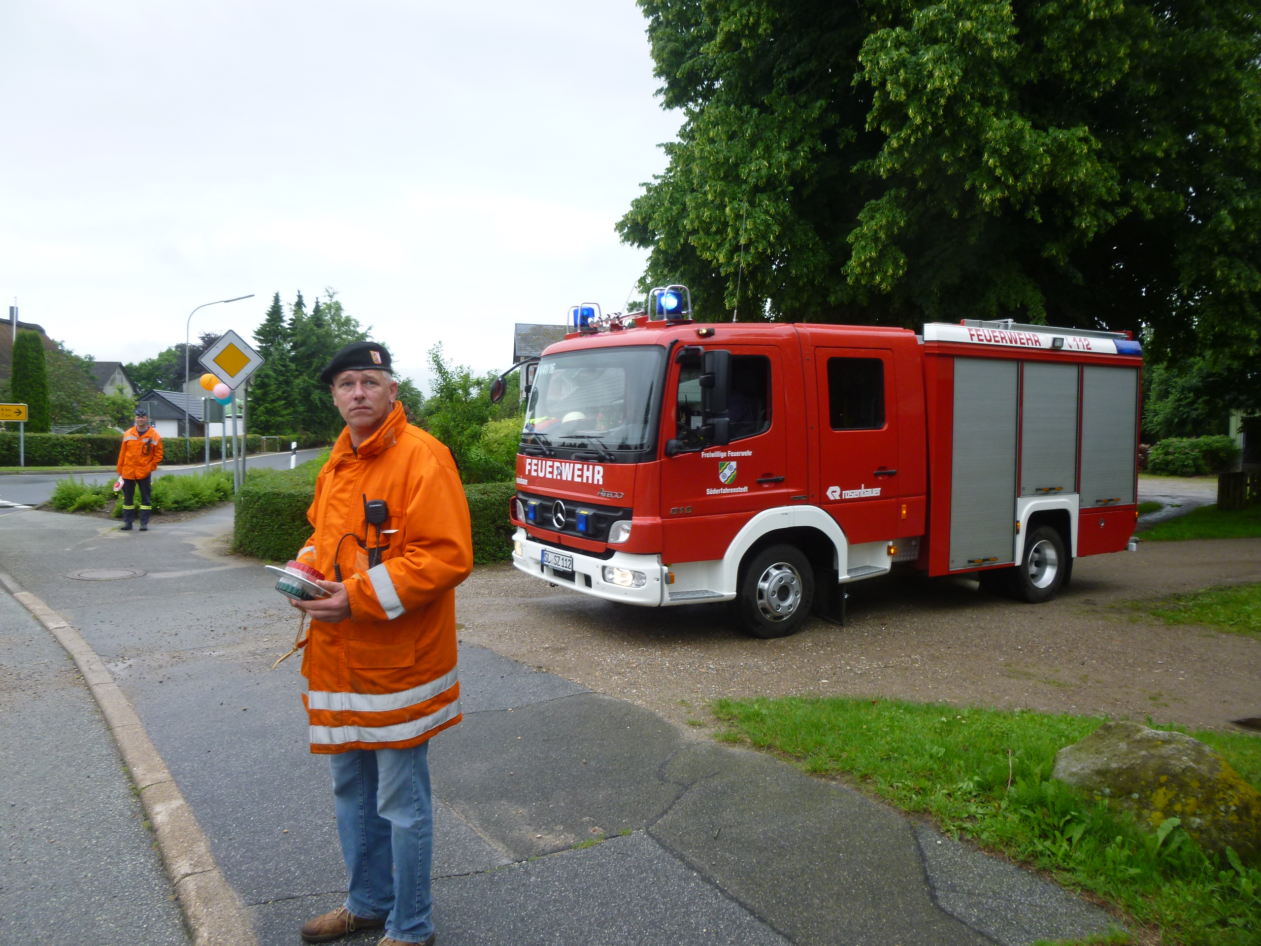 Ja, wir wollen dazugehören. Aber wir knüpfen das an zwei Voraussetzungen: 1. Wie gut klappt denn bisher die Zusammenarbeit zwischen Stolk und Süderfahrenstedt?“ – „Oh, wir sind hochzufrieden“, hörte man im Saal jemanden rufen. „Bei Alarm rücken die Süderfahrenstedter mit Blaulicht bei uns aus und wir machen bloß die Ausfahrt frei. Hier – gucken Sie selbst!“