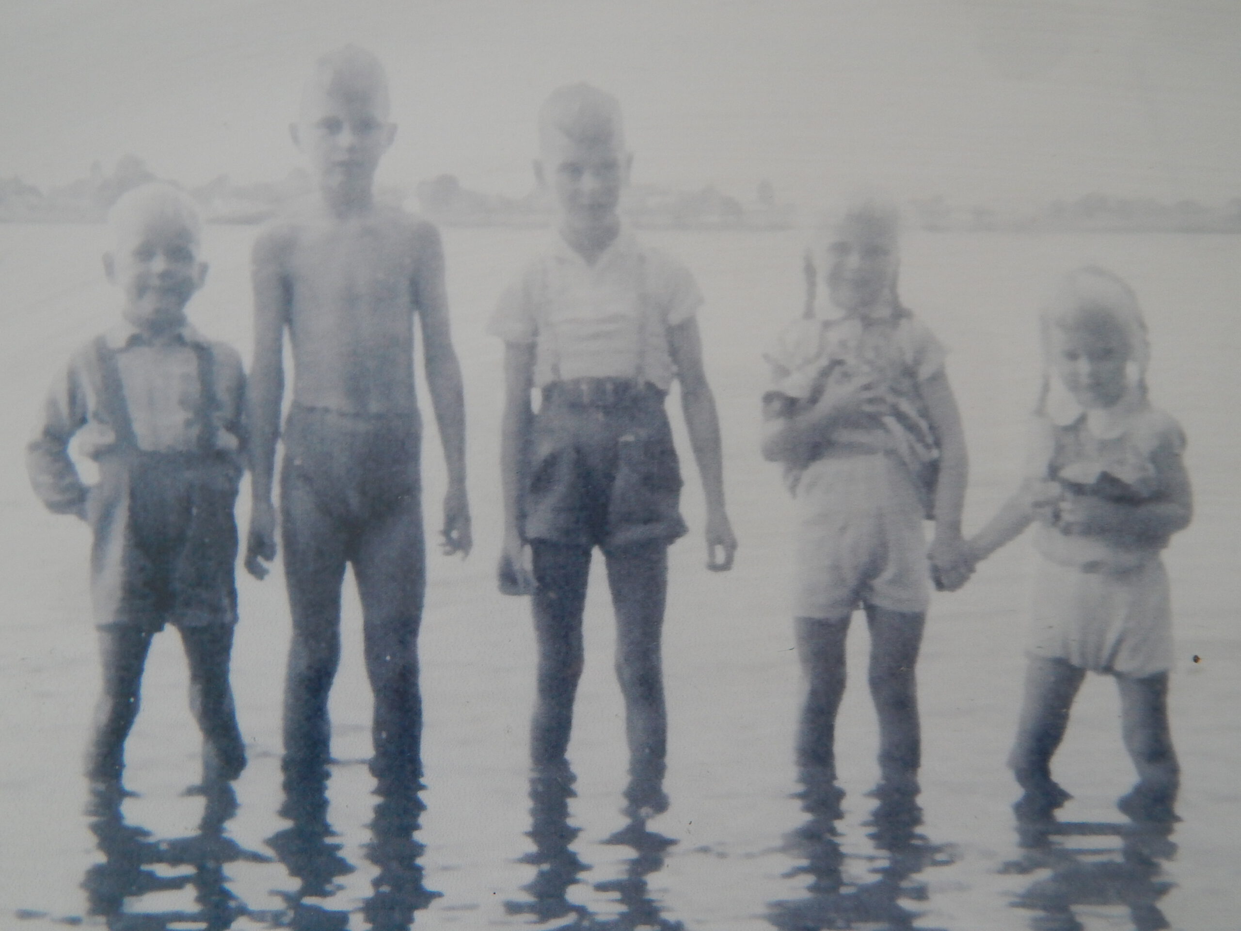 Aber, meine lieben Stolker, ich will unser Motiv für eine Fusion jetzt mal von der anderen Seite aufziehen: Es gibt doch unsere Freundschaft schon seit ewigen Zeiten. Erinnert euch: Wir haben euch eine eigene Stolker Badestelle an unserem See abgegeben. Hier der Beweis: Vier Stolker Geschwister mit einem Nachbarsjungen vor 67 Jahren bei uns im See: