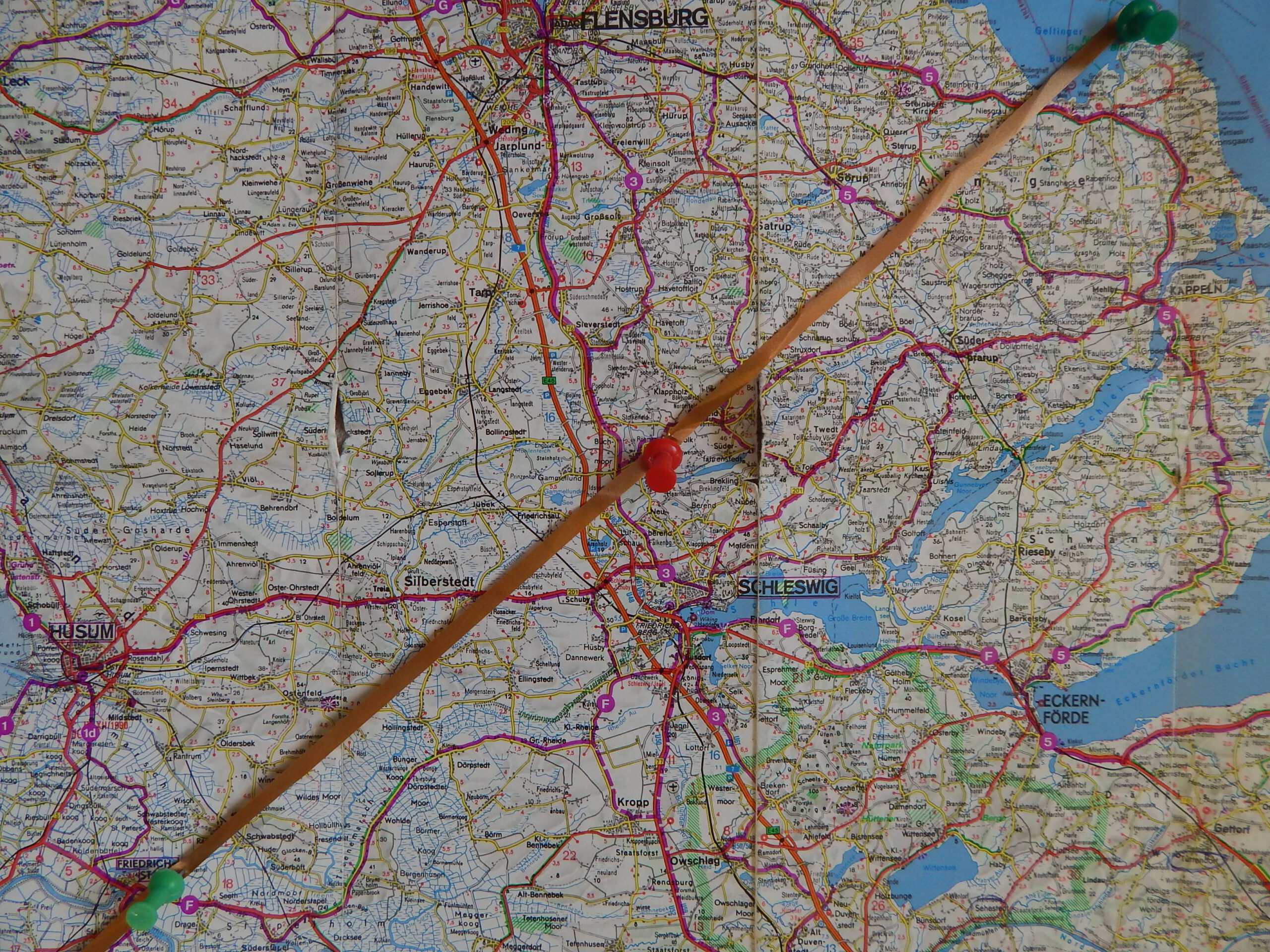 Hier liefere ich den Beweis: Wenn man vom östlichsten Punkt des Syssels, der Nordspitze der Geltinger Birk, eine gerade Linie zieht zum westlichsten Punkt, dem Zusammenfluss von Treene und Eider, wie er vor 1000 Jahren war, nämlich bei Mildterhof südlich von Schwabstedt, dann ist exakt die Hälfte dieser 66 km langen Strecke … ja, hier seht ihr es: auf Sandlum in Stolk!