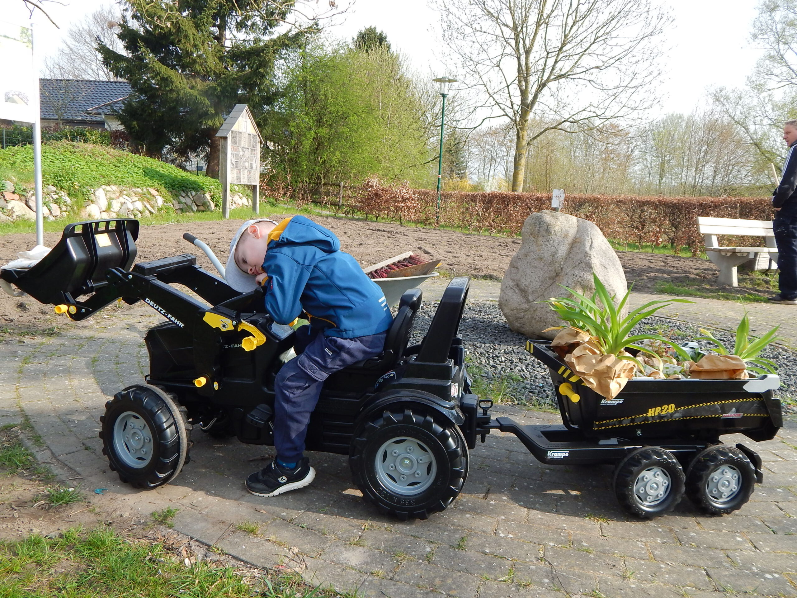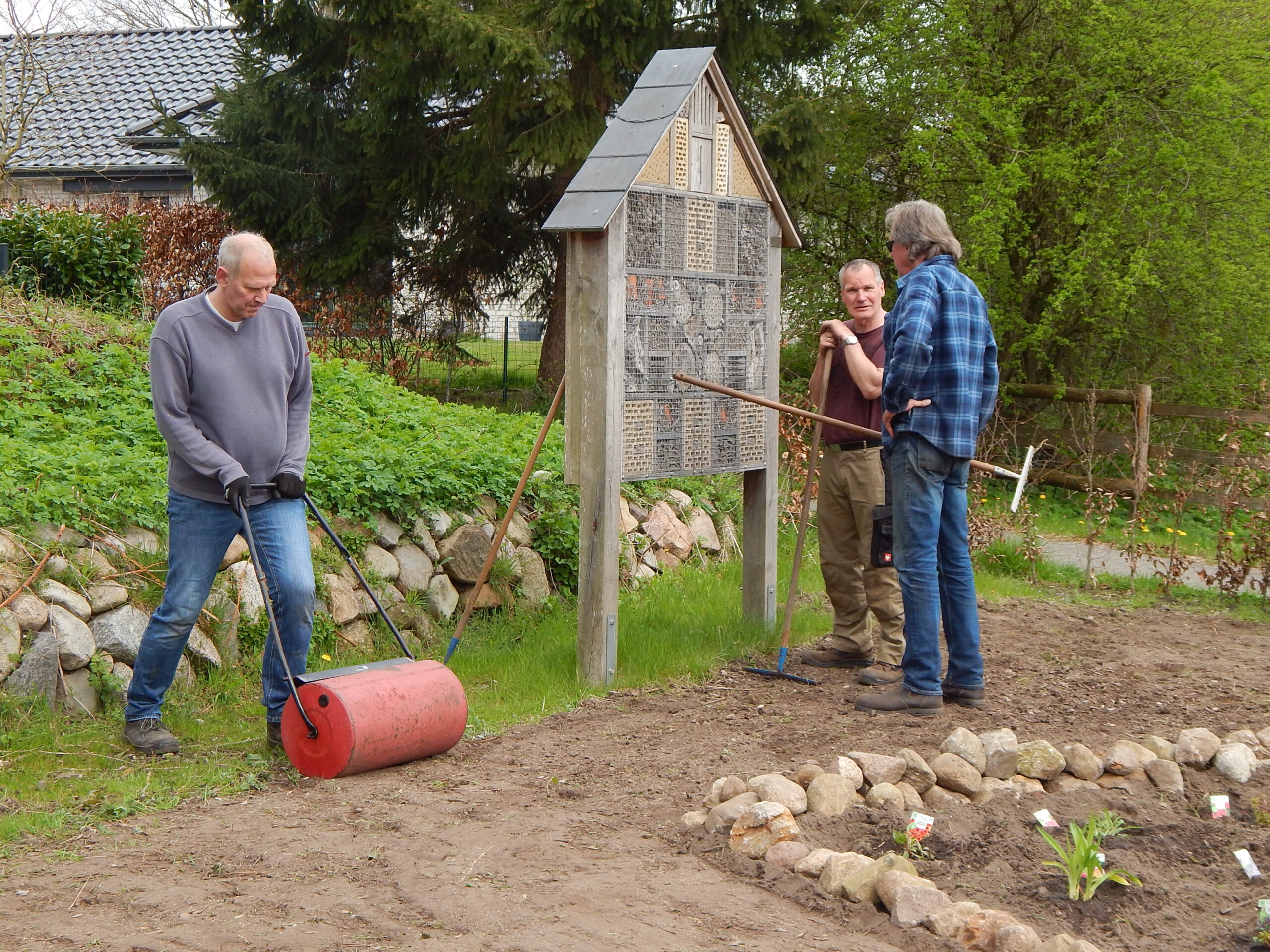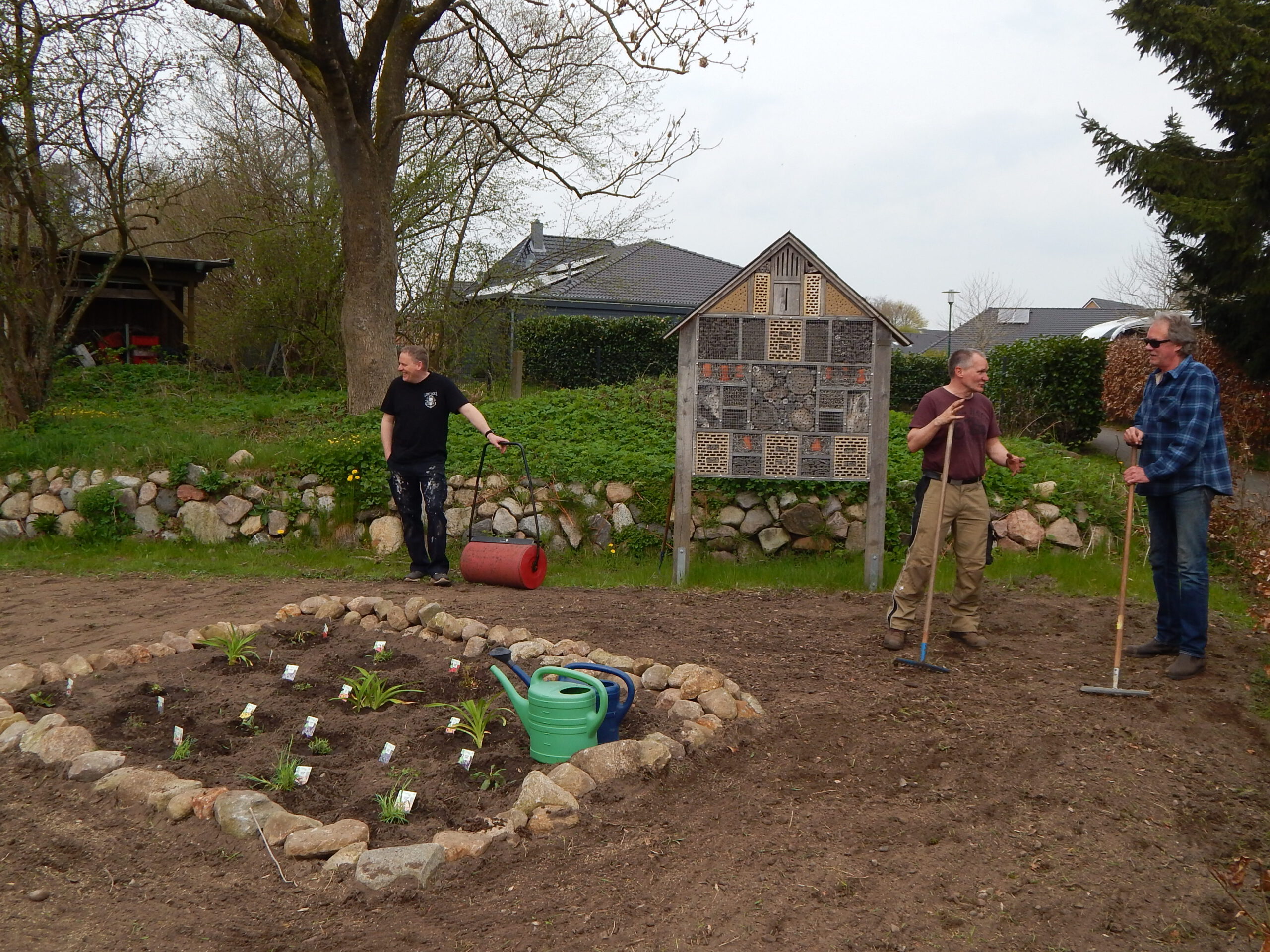 Diese hatten vorher beraten, dass in diesem Jahr dort keine Blühwiese entstehen soll, weil eine solche nur kurzzeitig hübsch aussieht, bis lange Strunken alles überragen. Stattdessen wurde Rasen angesät mit einem Blumenfeld darin. Dort werden zeitlich versetzt zu blühen beginnen besondere Arten einer Aster, Lilie, Nessel, Sonnenhut, Salbei, Minze, Nelke und Lavendel.