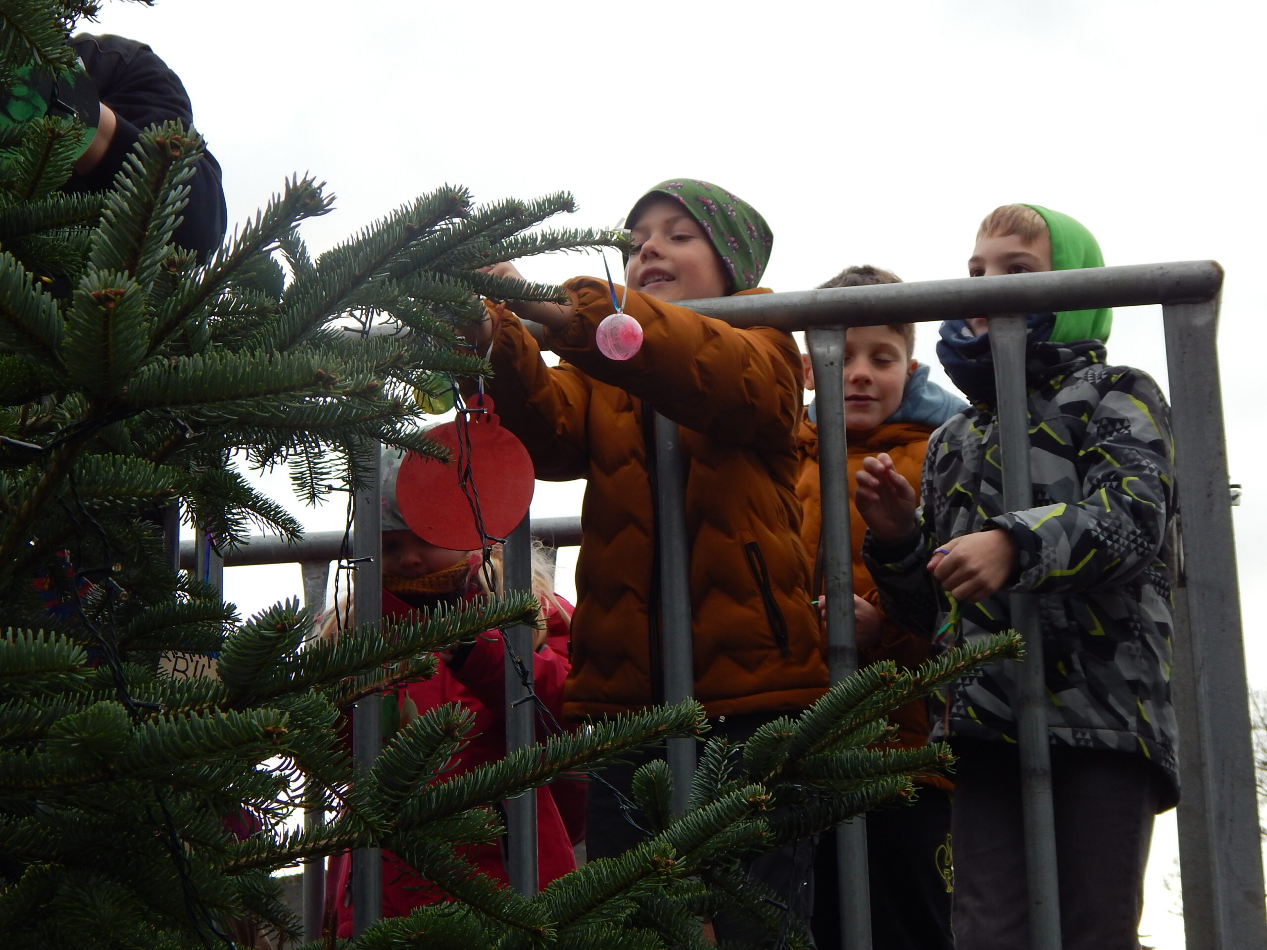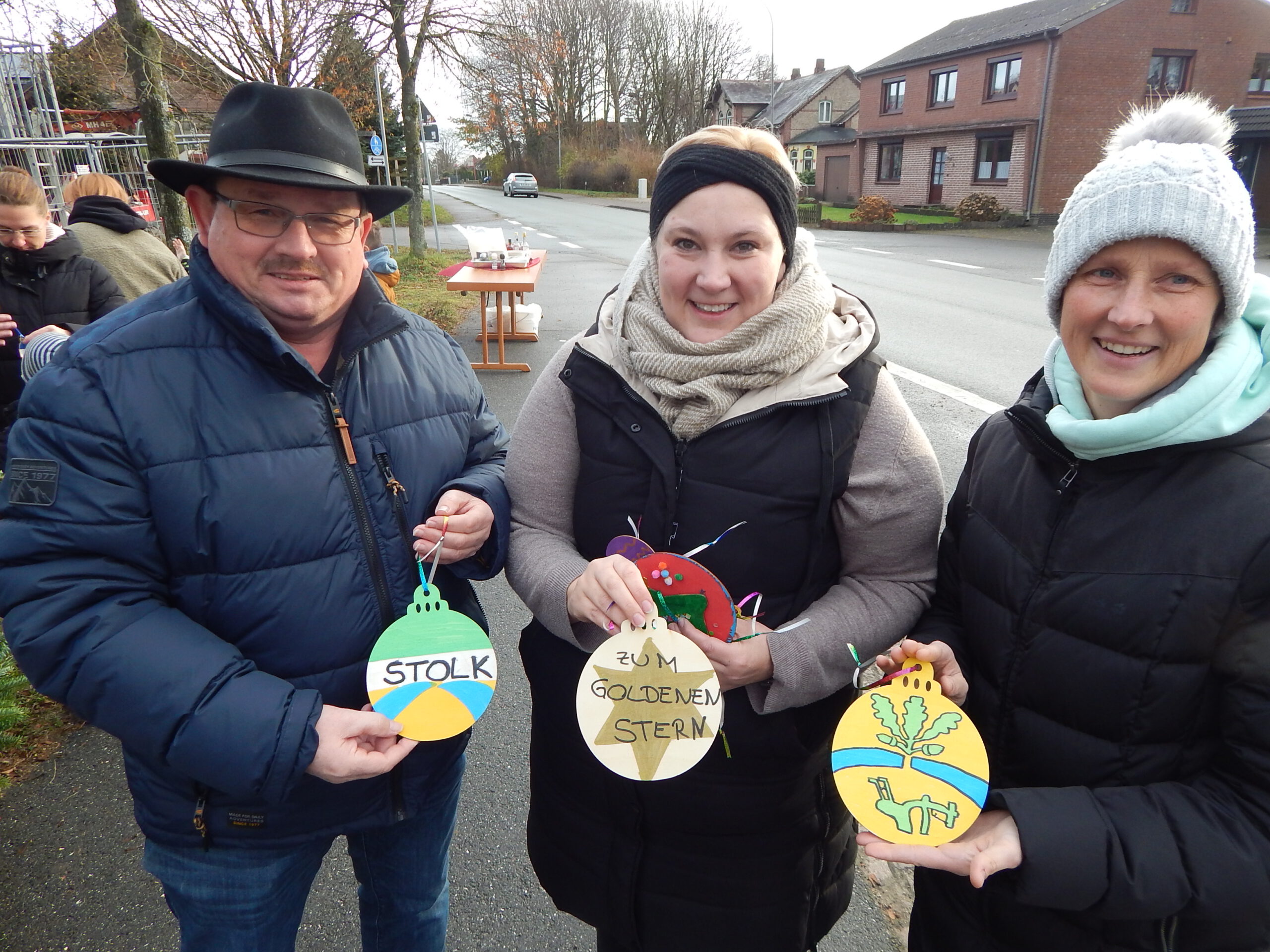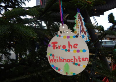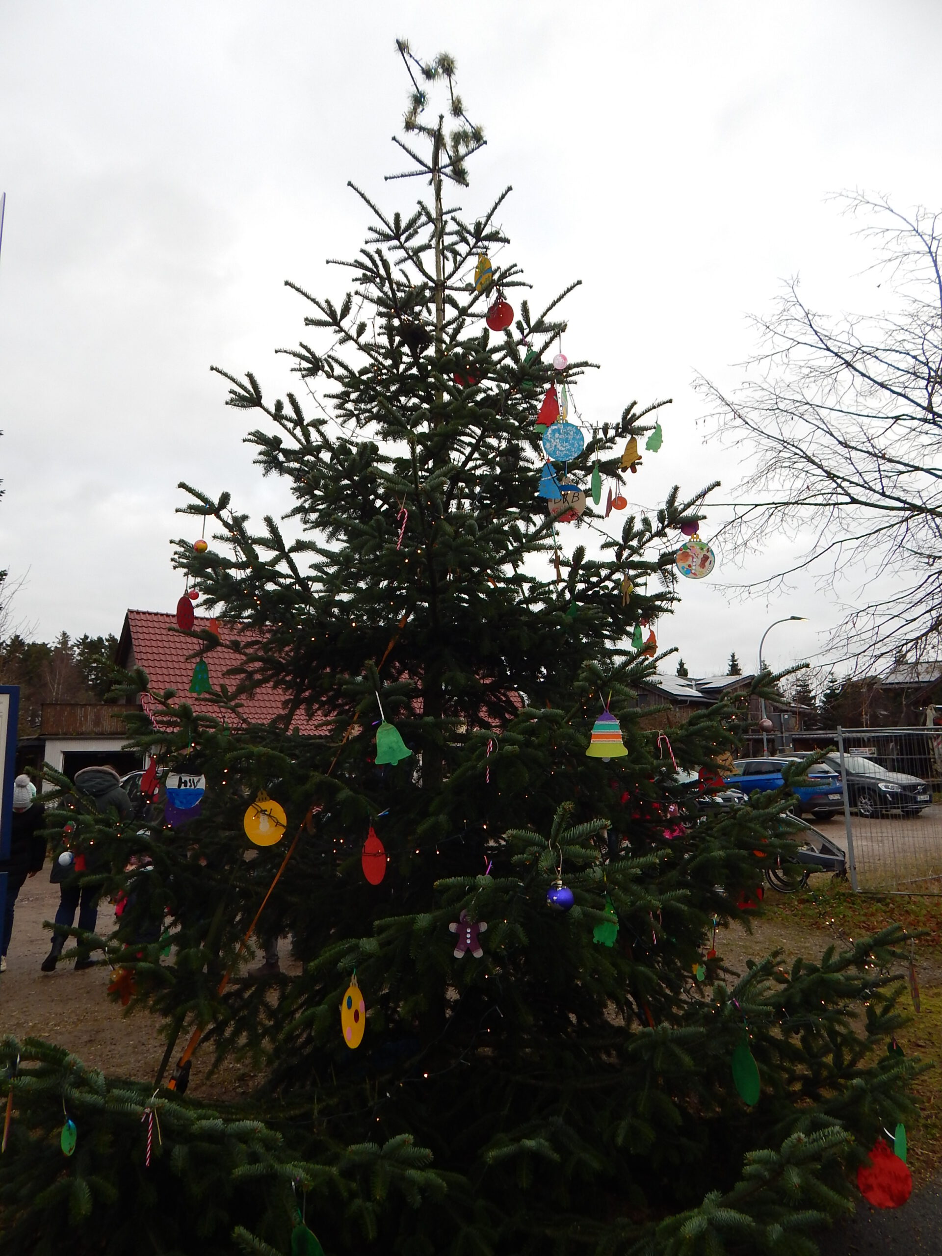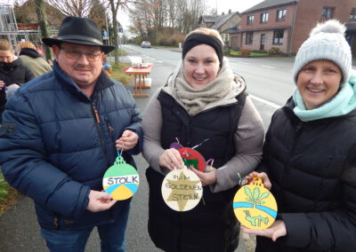 Dabei wurde besonders hervorgehoben die Elterninitiative, die sich unter der Leitung von Bente Meins und Vera Mundt erfolgreich darum gekümmert hatte, dass Kinder neue Dekorationsartikel gebastelt haben. Diese schmücken nun den großen Tannenbaum. Dort hängen wetterfest lackiert „Fröhliche Weihnachten“, ein Gruß mit Wappen von Stolk 2025, der HSV, sogar Borussia Dortmund und all das, was 22 Kinder beim Basteln in den Sinn gekommen ist.