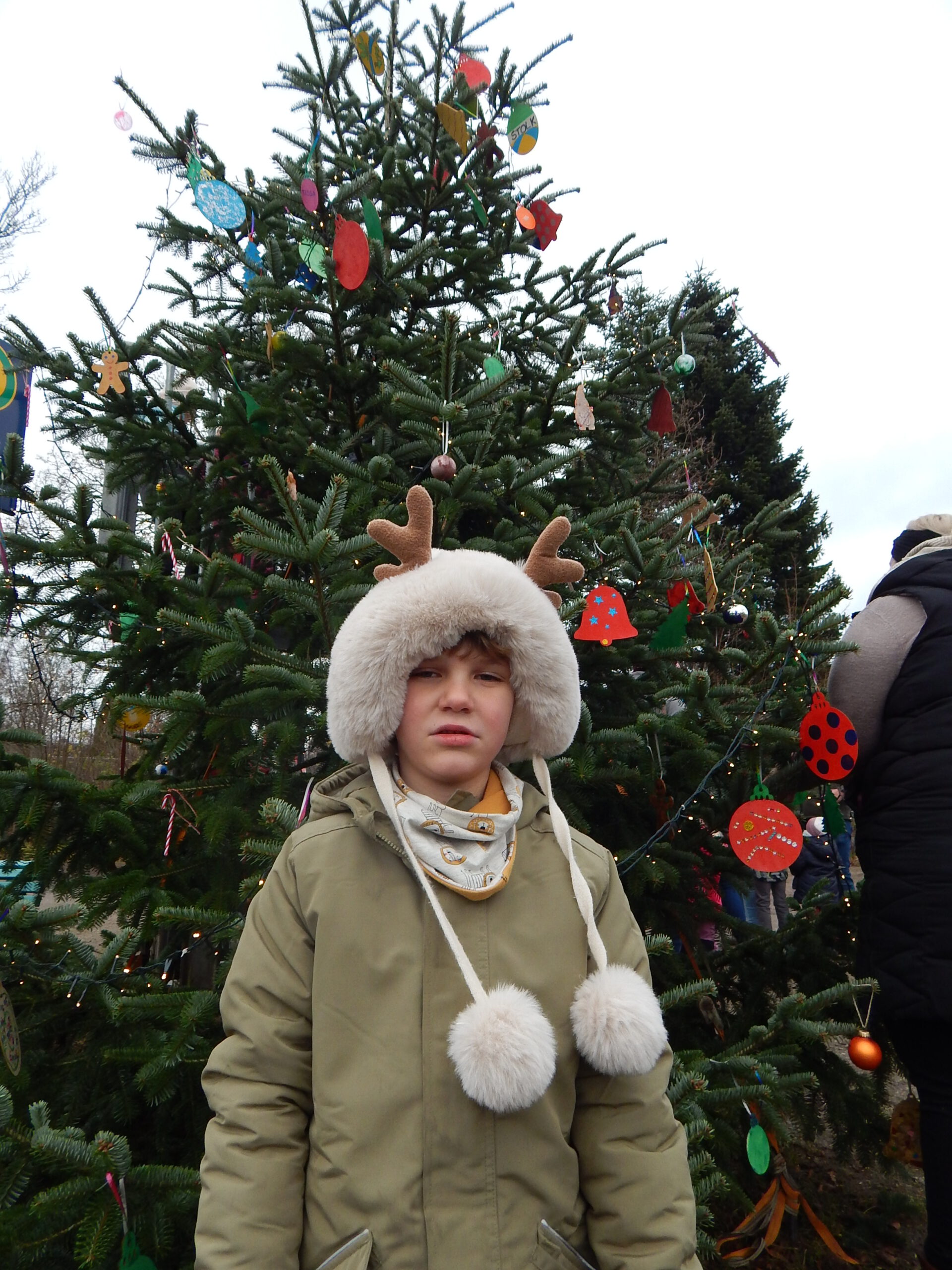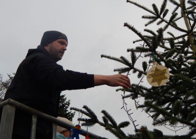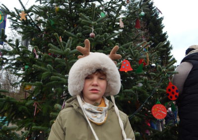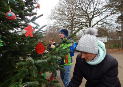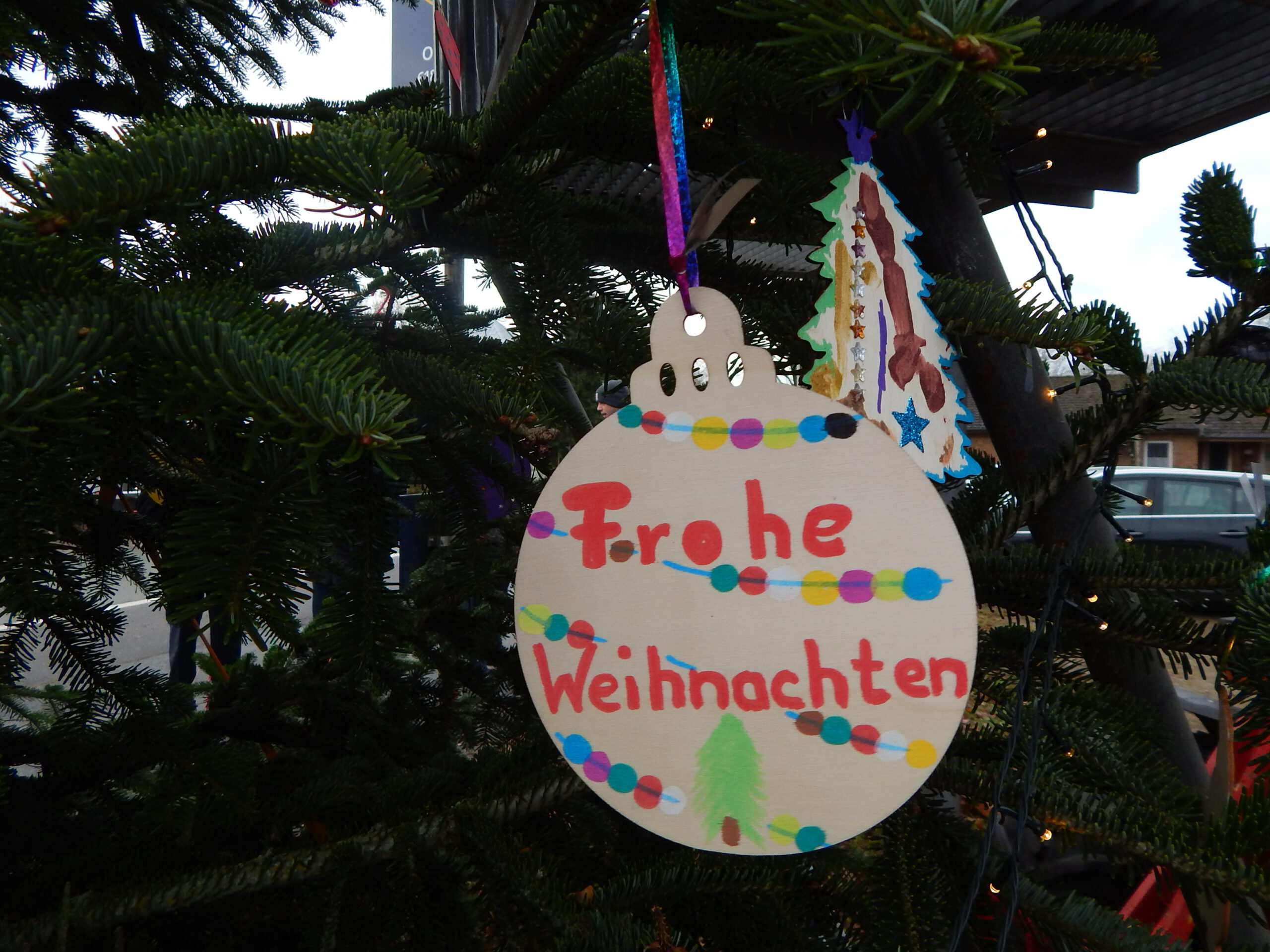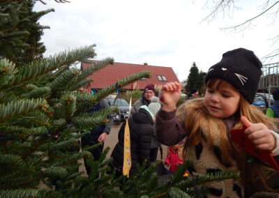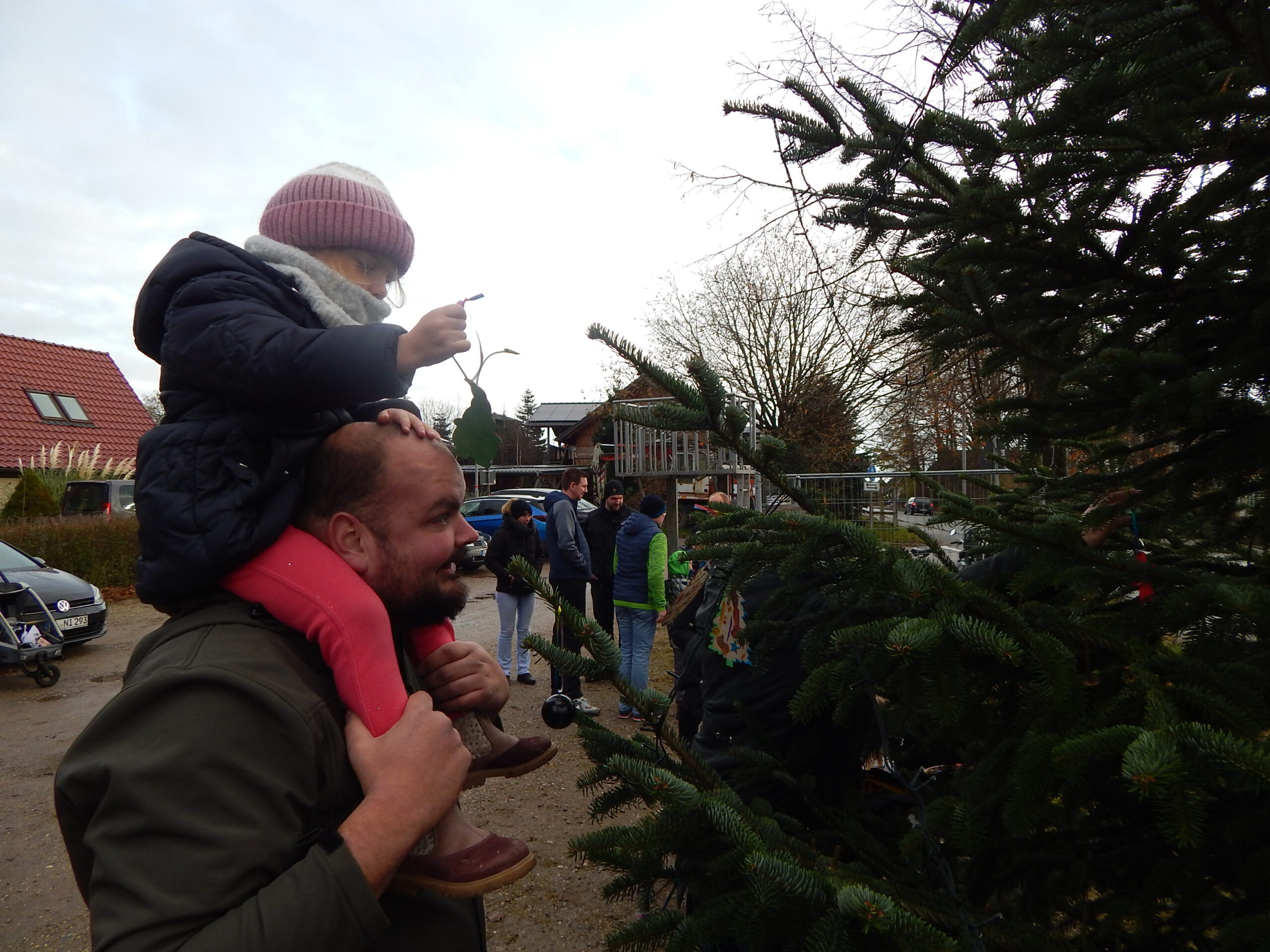 Dabei wurde besonders hervorgehoben die Elterninitiative, die sich unter der Leitung von Bente Meins und Vera Mundt erfolgreich darum gekümmert hatte, dass Kinder neue Dekorationsartikel gebastelt haben. Diese schmücken nun den großen Tannenbaum. Dort hängen wetterfest lackiert „Fröhliche Weihnachten“, ein Gruß mit Wappen von Stolk 2025, der HSV, sogar Borussia Dortmund und all das, was 22 Kinder beim Basteln in den Sinn gekommen ist.