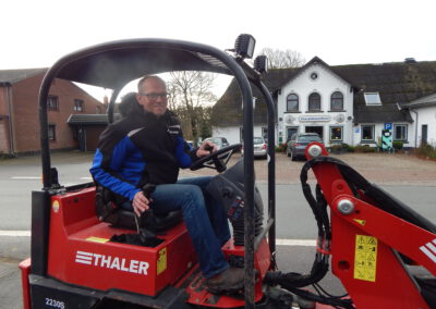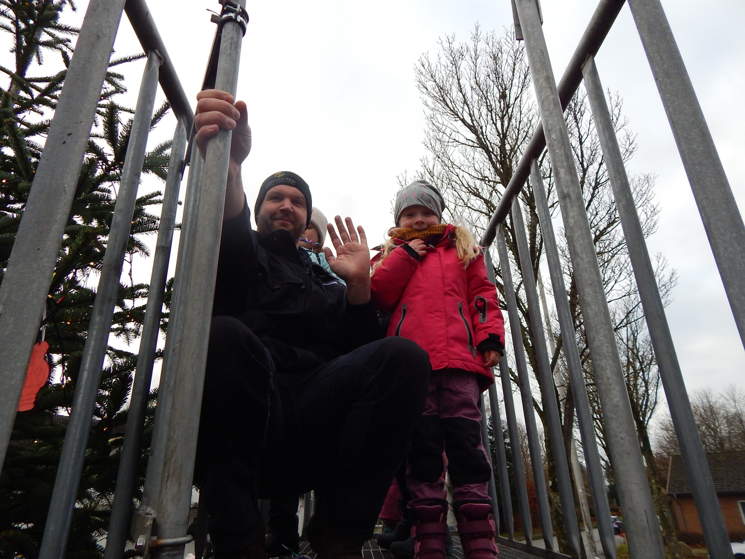 Um beim Schmücken an die Spitze des von Helmut und Thekla Neels erworbenen Nadelbaumes zu kommen, war Sönke Dreesen mit einem wendigen Fahrzeug im Einsatz, das den Feuerwehrmann Stephan Jeß und Kinder in die Höhe hievte.