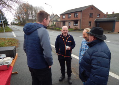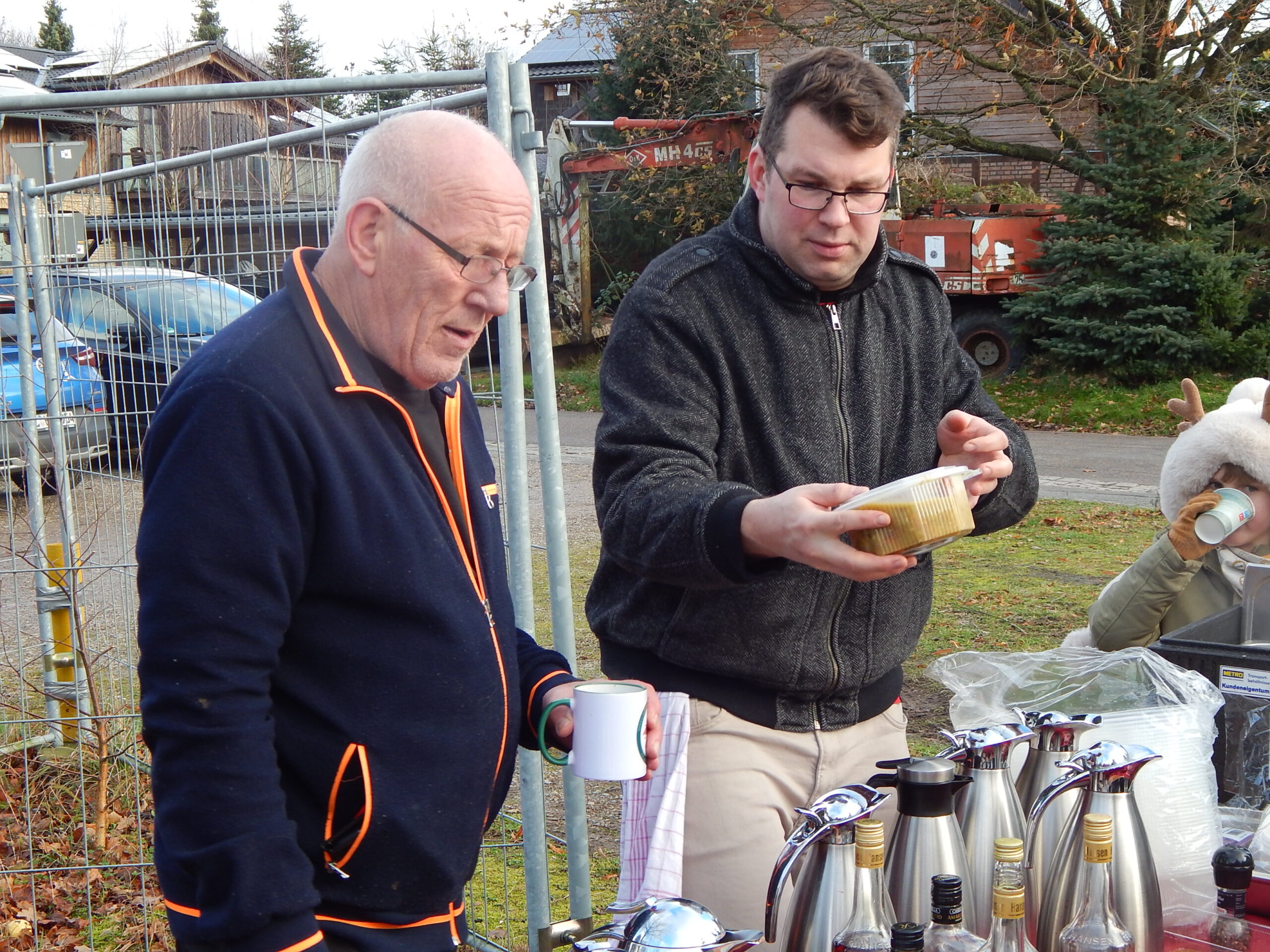 Nach getaner Arbeit überraschten die Gastwirte Jan und Uwe und ihr Mitarbeiter Hannes mit Erbsensuppe, Kakao und Punsch, der höherwertig verfeinert werden konnte, ohne dass einer etwas bezahlen musste. „Die Spende ist unser Beitrag dafür, dass unser Parkplatz durch die gemeindliche Aktion in der Weihnachtszeit aufgewertet wird“, sagte Jan-Wilhelm Frerichs und fügte hinzu: „Im nächsten Jahr dürfen gern noch mehr Stolker an diesem gemeindlichen Dorftreff teilnehmen.“