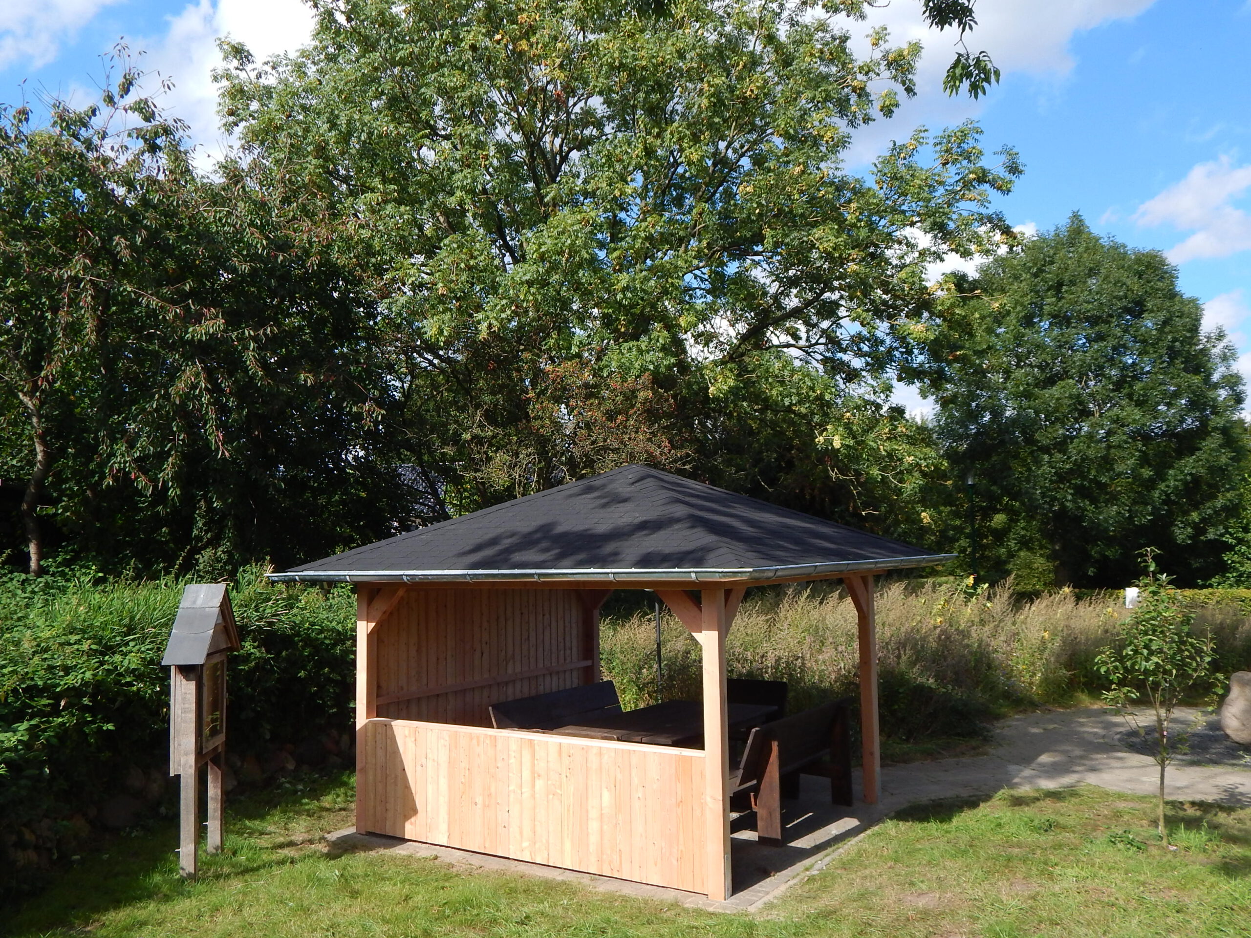 Auf dem „Platz am Eichenhof“ ist der Wetterschutz für die Sitzgruppe fertig. Eigentlich wollten die Zimmerleute am vergangenen Freitag nicht dort arbeiten; aber dann kamen sie doch, und die teilweise seitengeschützte überdachte Fläche sah schon am Wochenende aus wie auf unserem Foto.