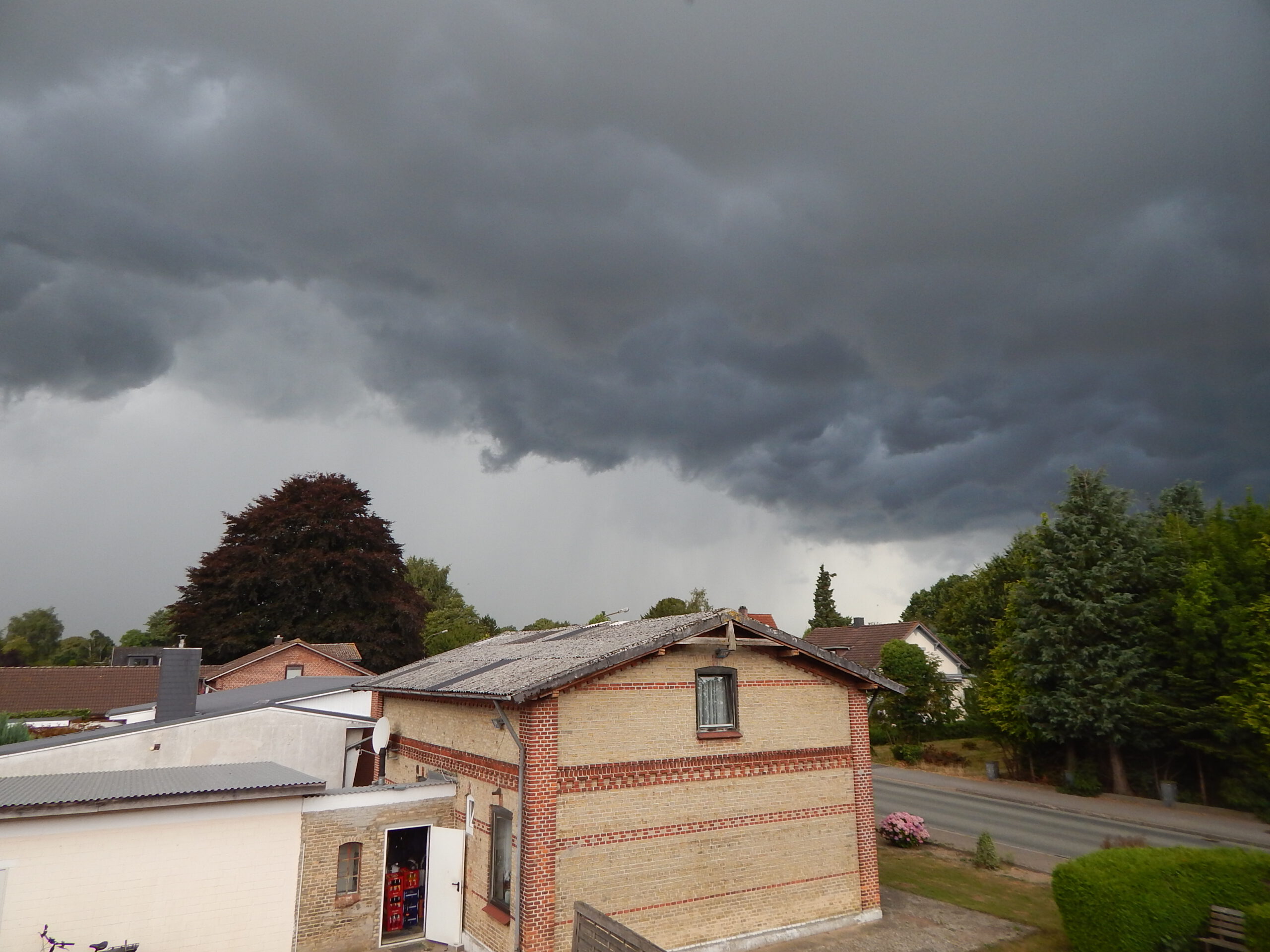 Während Bollingstedt, Langstedt und Eggebek teilweise „absoffen“, zeugten in Helligbek noch große Pfützen von „nur“ 14 mm Regen, und im Oberstolker „Süderende“ wurden gar nur 2 mm gemessen. Aber was sich am Himmel über Stolk aus dem verregneten Westen heranschob, sah um 16:20 Uhr doch so bedrohlich aus, dass es an dieser Stelle festgehalten wird zur Erinnerung daran, dass wir mit dem weiteren Wetterverlauf großes Glück gehabt haben.